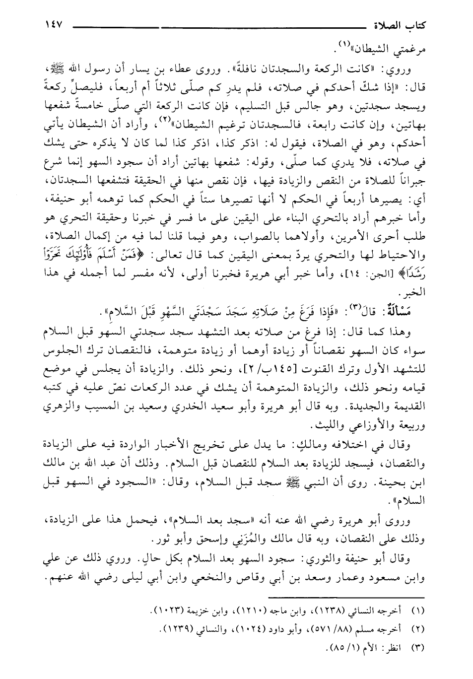 وقال في اختلافه ومالك: ما يدل على تخريج الأخبار الواردة فيه على الزيادة والنقصان، فيسجد للزيادة بعد السلام للنقصان قبل السلام. وذلك أن عبد الله بن مالك ابن بحينة. روى أن النبي - صلى الله عليه وسلم - سجد قبل السلام، وقال: "السجود في السهو قبل السلام".