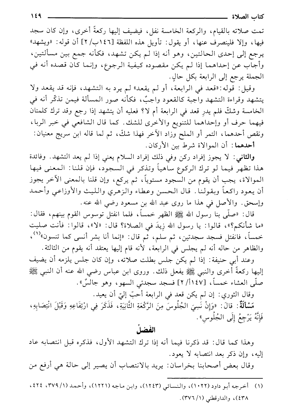 تمت صلاته بالقيام، والركعة الخامسة نفل، فيضيف إليها ركعة أخرى، وإن كان سجد فيها، وإلا فلينصرف عنها، أو يقول: تأويل هذه اللفظة [146 ب / 2] أن قول: "ويتشهد" يرجع إلى إحدى الحالتين، وهو أنه إذا لم يكن تشهد، فكأنه جمع بين مسألتين، وأجاب عن إحداهما إذا لم يكن مقصوده كيفية الرجوع، وإنما كان قصده أنه في الجملة يرجع إلى الرابعة بكل حال.