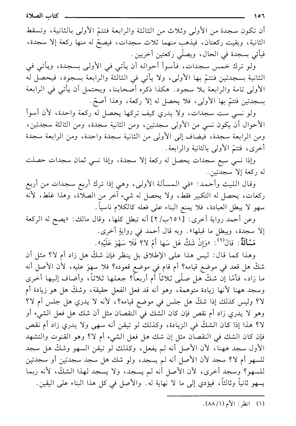 وقال الليث وأحمد: "في المسألة الأولى، وهي إذا ترك أربع سجدات من أربع ركعات، يحصل له التكبير فقط، ولا يحصل له شيء آخر من الصلاة، وهذا غلط، لأنه سهو لا يبطل العبادة، فلا يمنع البناء على فعله كالكلام ناسيا.