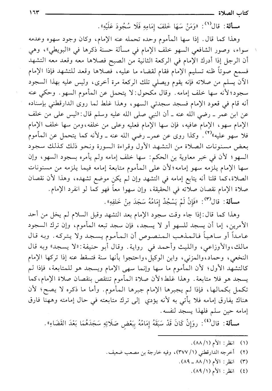 وهذا كما قال. إذا سها المأموم وحده تحمله عنه الإمام، وكان وجود سهوه وعدمه سواء، وصور الشافعي السهو خلف الإمام في مسألة حسنة ذكرها في "البويطي"، وهي أن الرجل إذا أدرك الإمام في الركعة الثانية من الصبح فصلاها معه وقعد معه التشهد فسمع صوتا ظنه تسليم الإمام فقام لقضاء ما عليهء فصلاها وقعد للتشهد فإذا الإمام الآن يسلم من صلاته فإنه يقوم ويصلي تلك الركعة مرة أخرى، وليس عليه بهذا السجود سجود؛ لأنه سها خلف إمامه. وقال مكحول: لا يتحمل عن المأموم السهو. وحكي عنه أنه قام في قعود الإمام فسجد سجدتي السهو، وهذا غلط لما روى الدارقطني بإسناده عن ابن عمر - رضي الله عنه - أن النبي صلى الله عليه وسلم قال: "ليس على من خلف الإمام سهو، الإمام عافيه، فإن سها الإمام فعليه وعلى من خلفه، ومن سها خلف الإمام فلا سهو عليه". وكذا روى عن عمر- رضي الله عنه - ولأنه كما يتحمل عن المأموم بعض مسنونات الصلاة من التشهد الأول وقراءة السورة ونحو ذلك كذلك سجود السهو: لأن في خبر معاوية بن الحكم: سها خلف إمامه ولم يأمره بسجود السهو، وإن سها الإمام يلزمه سهو إمامه؛ لأن على المأموم متابعة إمامه فيما يلزمه من مسنونات الصلاة، كما قلنا أنه يتابع إمامه في التشهد وان لم يكن موضع تشهده، وهذا لأن نقصان صلاة الإمام نقصان صلاته في الحقيقة، وإن سهوا معا فهو كما لو أنفرد الإمام.