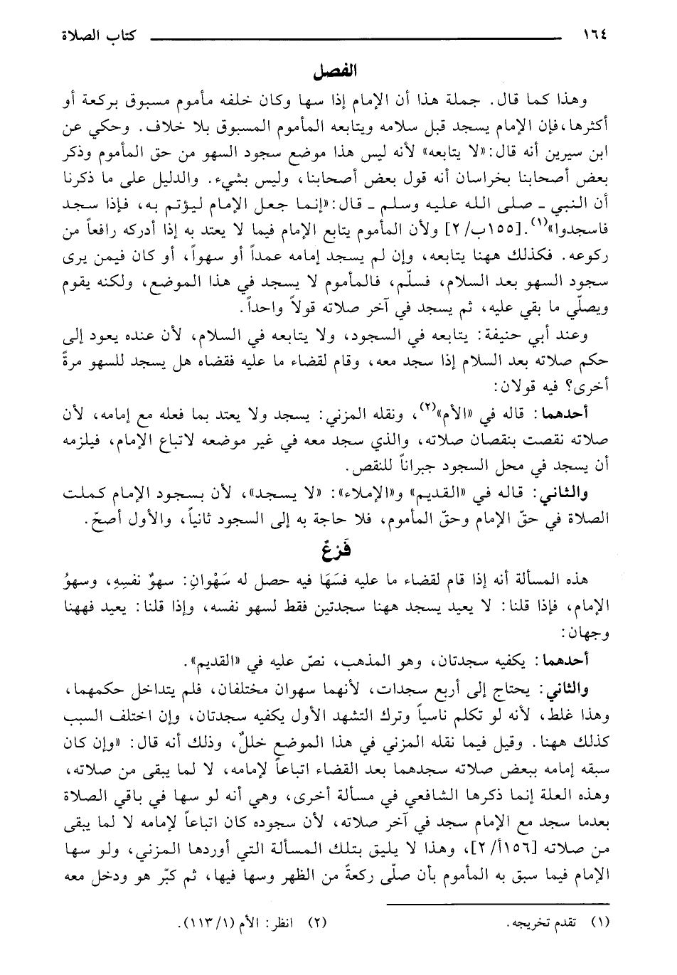 والثاني: يحتاج إلى أربع سجدات، لأنهما سهوان مختلفان، فلم يتداخل حكمهما، وهذا غلط، لأنه لو تكلم ناسياً وترك التشهد الأول يكفيه سجدتان، وإن اختلف السبب كذلك ههنا. وقيل فيما نقله المزني في هذا الموضع خلل، وذلك أنه قال: "وإن كان سبقه إمامه ببعض صلاته سجدهما بعد القضاء إتباعاً لإمامه، لا لما يبقى من صلاته، وهذه العلة إنما ذكرها الشافعي في مسألة أخرى، وهي أنه لو سها في باقي الصلاة بعدما سجد مع الإمام سجد في آخر صلاته، لأن سجوده كان إتباعاً لإمامه لا لما يبقى من صلاته [156 أ / 2]، وهذا لا يليق بتلك المسألة التي أوردها المزني، ولو سها الإمام فيما سبق به المأموم بأن صلى ركعة من الظهر وسها فيها، ثم كبر هو ودخل معه