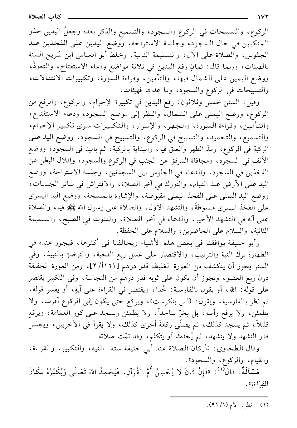 وقال الطحاوي: "أركان الصلاة عند أبي حنيفة ستة: النية، والتكبير، والقراءة، والقيام، والركوع، والسجود".