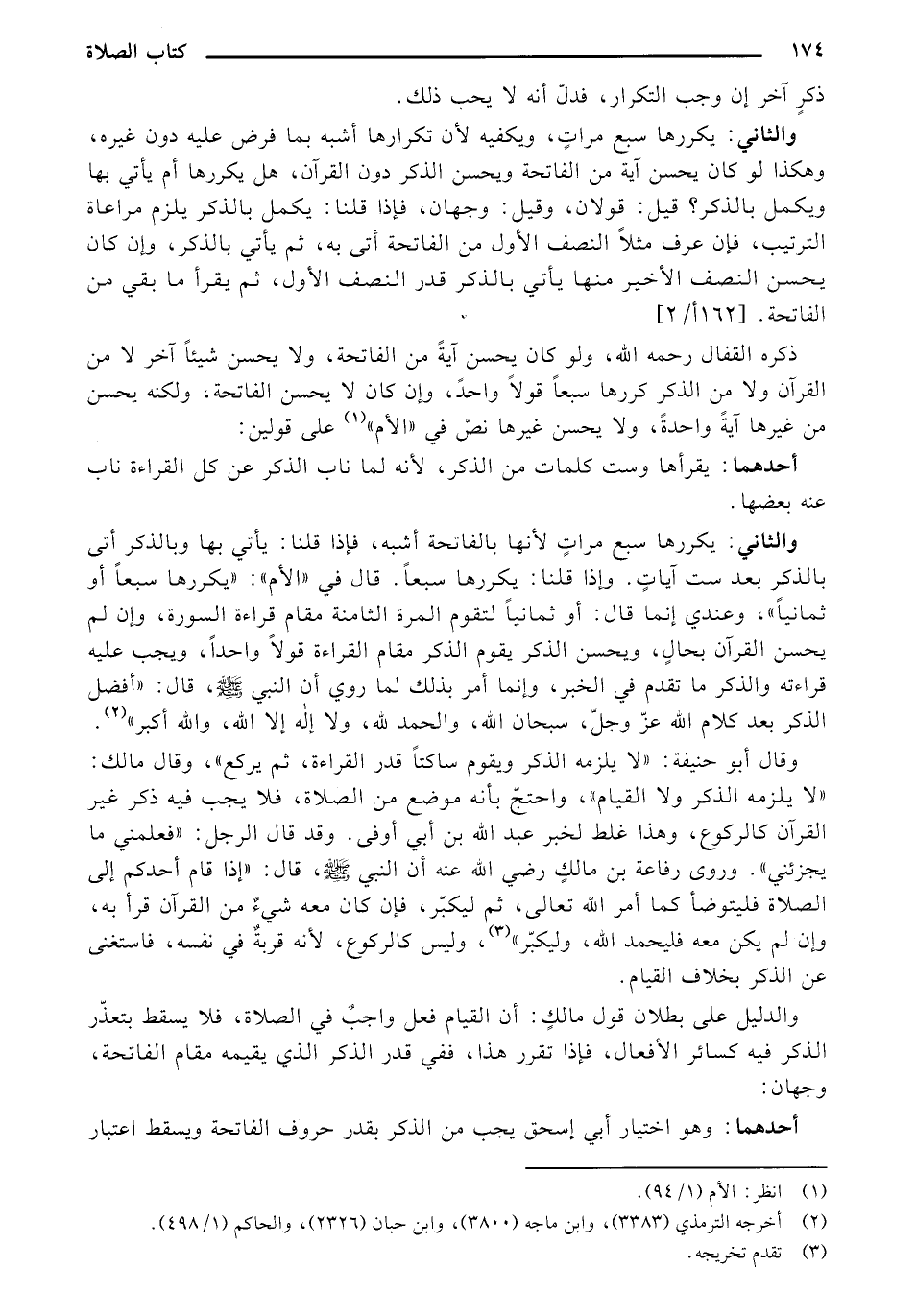 والثاني: يكررها سبع مرات لأنها بالفاتحة أشبه، فإذا قلنا: يأتي بها وبالذكر أتى بالذكر بعد ست آيات. وإذا قلنا: يكررها سبعاً. قال في "الأم": "يكررها سبعاً أو ثمانياً"، وعندي إنما قال: أو ثمانياً لتقوم المرة الثامنة مقام قراءة السورة، وإن لم يحسن القرآن بحالٍ، ويحسن الذكر يقوم الذكر مقام القراءة قولاً واحداً، ويجب عليه قراءته والذكر ما تقدم في الخبر، وإنما أمر بذلك لما روي أن النبي - صلى الله عليه وسلم -، قال: "أفضل الذكر بعد كلام الله عز وجل، سبحان الله، والحمد لله، ولا إله إلا الله، والله أكبر".