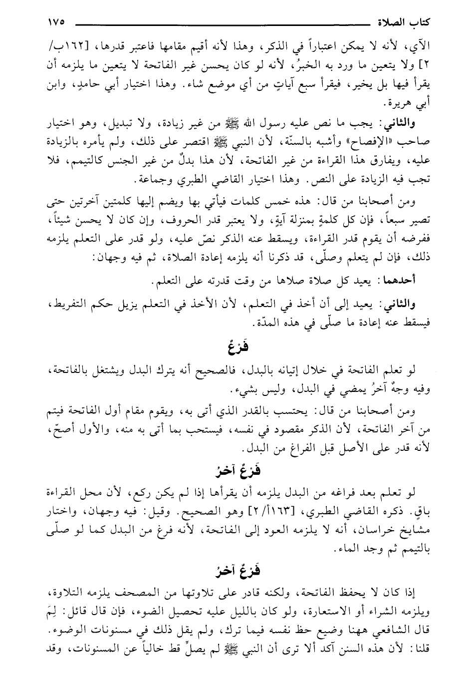 إذا كان لا يحفظ الفاتحة، ولكنه قادر على تلاوتها من المصحف يلزمه التلاوة، ويلزمه الشراء أو الاستعارة، ولو كان بالليل عليه تحصيل الضوء، فإن قال قائل: لم قال الشافعي ههنا وضيع حظ نفسه فيما ترك، ولم يقل ذلك في مسنونات الوضوء. قلنا: لأن هذه السنن أكد ألا ترى أن النبي - صلى الله عليه وسلم - لم يصل قط خالياً عن المسنونات، وقد