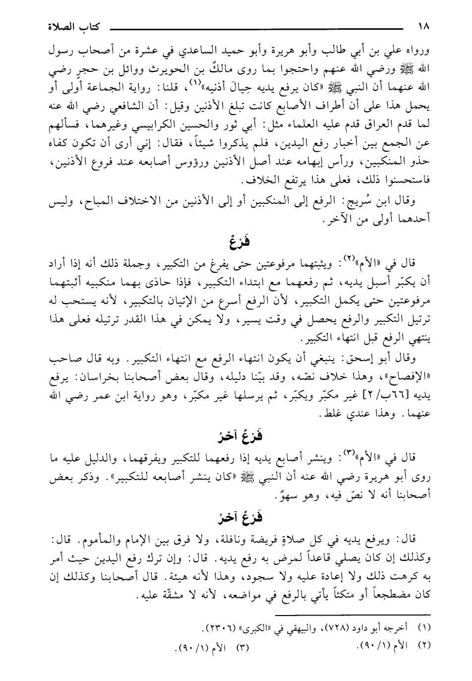 ورواه علي بن أبي طالب وأبو هريرة وأبو حميد الساعدي في عشرة من أصحاب رسول الله - صلى الله عليه وسلم - ورضي الله عنه واحتجوا بما روى مالكٌ بن الحويرث ووائل بن حجٍر رضي الله عنه أن النبي - صلى الله عليه وسلم - (كان يرفع يديه حيالَ أذنيه)، قلنا: رواية الجماعة أولى أو يحمل هذا على أن أطراف الأصابع كانت تبلغ الأذنين وقيل: أن الشافعي رضي الله عنه لما قدم العراق قدم عليه العلماء مثل: أبي ثور والحسين الكرابيسي وغيرهما، فسألهم عن الجمع بين أخبار رفع اليدين، فلم يذكروا شيئًا، فقال: إني أرى أن تكون كفاه
