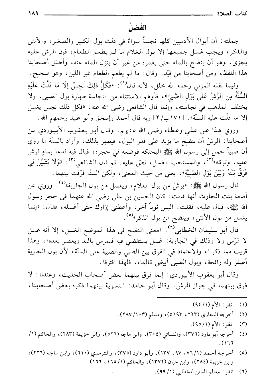 قال رسول الله - صلى الله عليه وسلم -: "يرش من بول الغلام، ويغسل من بول الجارية". وروي عن أمامة بنت الحارث أنها قالت: كان الحسين بن علي رضي الله عنهما في حجر رسول الله - صلى الله عليه وسلم -، فبال عليه، فقلت: البس ثوباً آخر، وأعطني إزارك حتى أغسله، فقال: "إنما يغسل من بول الأنثى، وينضح من بول الذكر".