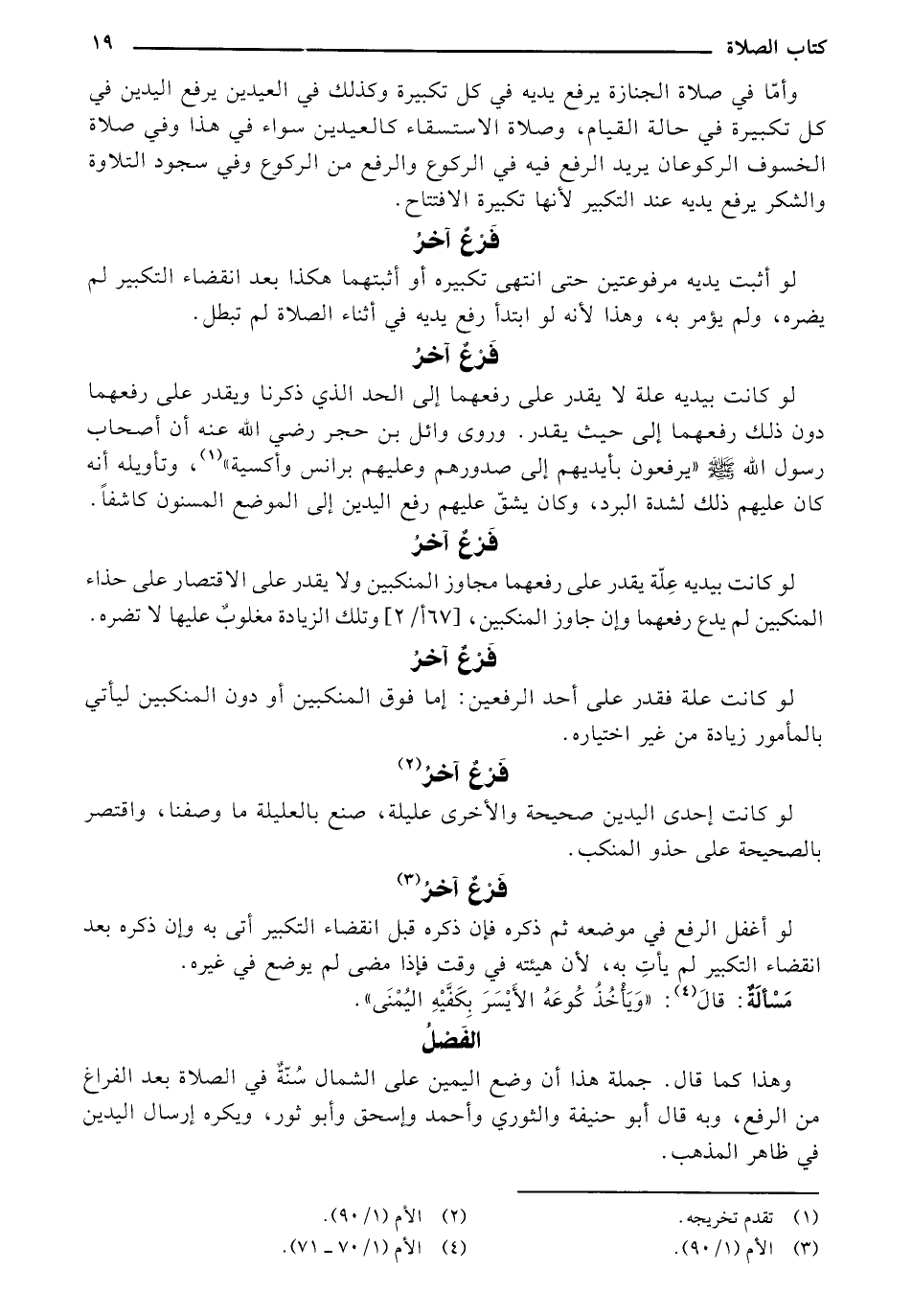 لو كانت بيديه علة لا يقدر على رفعهما إلى الحد الذي ذكرنا ويقدر على رفعهما دون ذلك رفعهما إلى حيث يقدر. وروى وائل بن حجر - صلى الله عليه وسلم - أن أصحاب رسول الله - صلى الله عليه وسلم - (يرفعون بأيديهم إلى صدورهم وعليهم برانس وأكسية)، وتأويله أنه كان عليهم ذلك لشدة البرد، وكان يشّق عليهم رفع اليدين إلى الموضع المسنون كاشفًا.