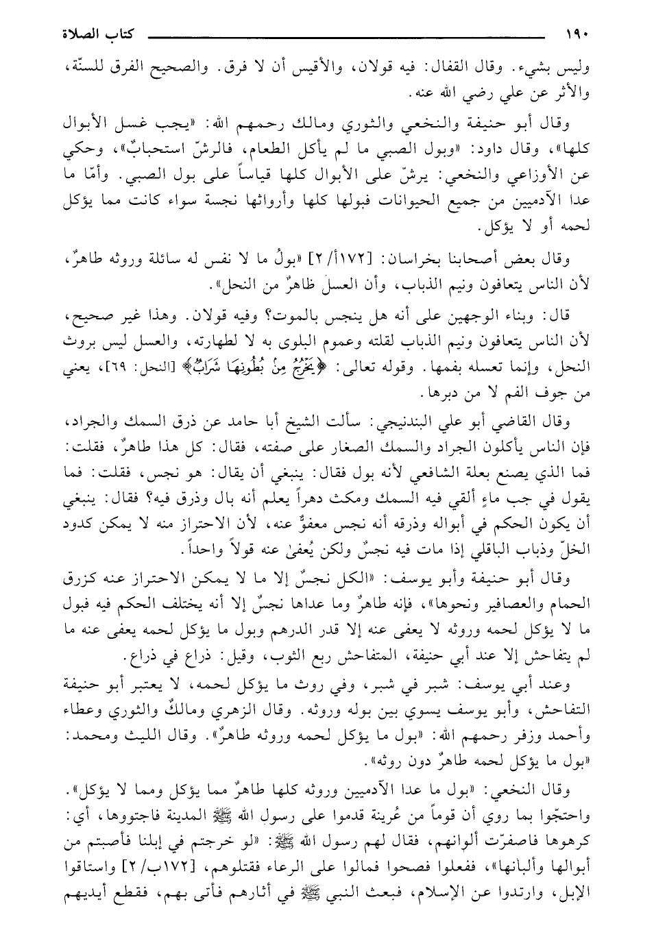 وعند أبي يوسف: شبر في شبر، وفي روث ما يؤكل لحمه، لا يعتبر أبو حنيفة التفاحش، وأبو يوسف يسوي بين بوله وروثه. وقال الزهري ومالك والثوري وعطاء وأحمد وزفر رحمهم الله: "بول ما يؤكل لحمه وروثه طاهر". وقال الليث ومحمد: "بول ما يؤكل لحمه طاهر دون روثه".