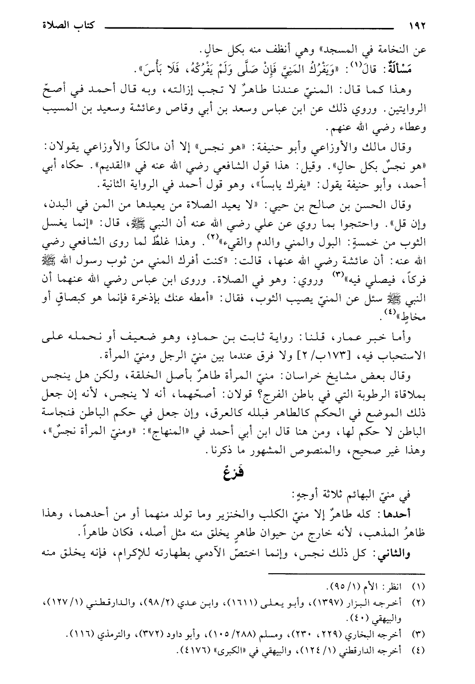 وقال الحسن بن صالح بن حيي: "لا يعيد الصلاة من يعيدها من المن في البدن، وإن قل". واحتجوا بما روي عن علي رضي الله عنه أن النبي - صلى الله عليه وسلم -، قال: "إنما يغسل الثوب من خمسة: البول والمني والدم والقيء". وهذا غلط لما روى الشافعي رضي الله عنه: أن عائشة رضي الله عنها، قالت: "كنت أفرك المني من ثوب رسول الله - صلى الله عليه وسلم - فركا، فيصلي فيه" وروي: وهو في الصلاة. وروى ابن عباس رضي الله عنهما أن النبي - صلى الله عليه وسلم - سئل عن المني يصيب الثوب، فقال: "أمطه عنك بإذخرة فإنما هو كبصاق أو مخاطٍ".
