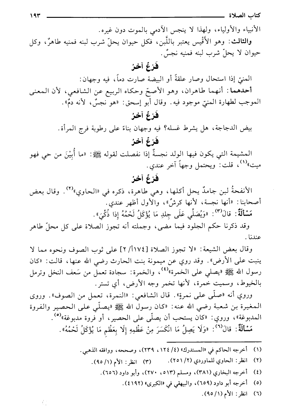 وروي أنه "صلى على نمرة". قال الشافعي: "النمرة، تعمل من الصوف". وروى المغيرة بن شعبة رضي الله عنه: "كان رسول الله - صلى الله عليه وسلم - "يصلي على الحصير والفروة المدبوغة"، وروي: "كان يستحب أن يصلى على الحصير، أو فروة مدبوغة".
