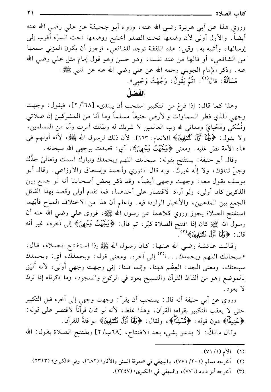 وهذا كما قال: إذا فرغ من التكبير استحب أن يبتدئ [68 أ/ 2]، فيقول: وجهت وجهي للذي فطر السماوات والأرض حنيفًا مسلمًا وما أنا من المشركين إن صلاتي وُنُسكي وَمْحياَي ومماتي لله رب العالمين لا شريك له وبذلك أمرت وأنا من المسلمين، ولا يقول: {وَأَنَا أَوَّلُ الْمُسْلِمِينَ} [الأنعام: 163]. لأن ذلك لرسول الله - صلى الله عليه وسلم -، لأنه أولهم في هذه الأمة نصّ عليه. ومعنى {وَجَّهْتُ وَجْهِيَ}، أي: قصدت بوجهي الله سبحانه.