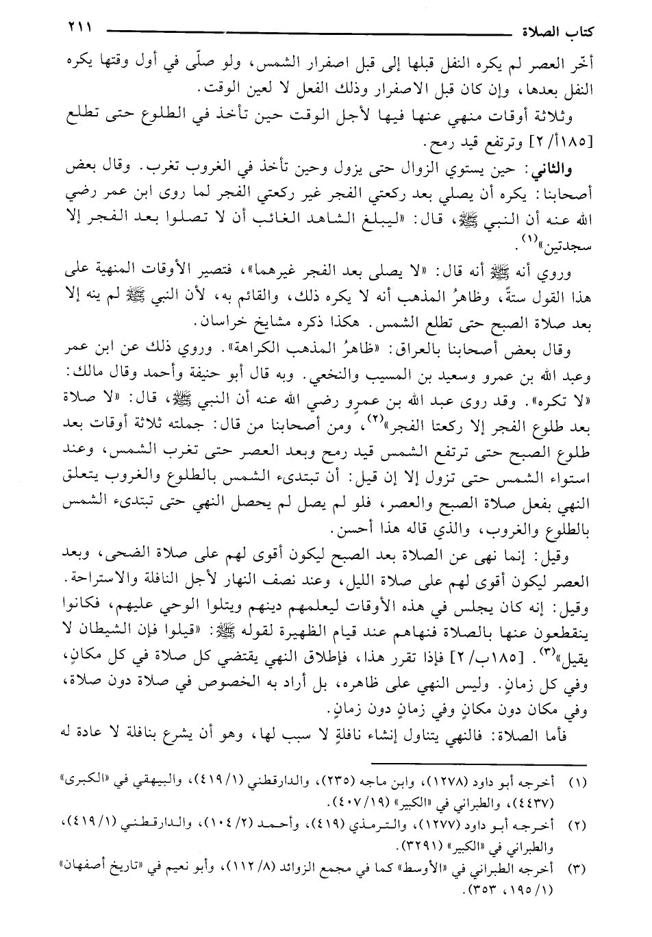 وقال بعض أصحابنا بالعراق: "ظاهر المذهب الكراهة". وروي ذلك عن ابن عمر وعبد الله بن عمرو وسعيد بن المسيب والنخعي. وبه قال أبو حنيفة وأحمد وقال مالك: "لا تكره". وقد روى عبد الله بن عمرو رضي الله عنه أن النبي - صلى الله عليه وسلم -، قال: "لا صلاة بعد طلوع الفجر إلا ركعتا الفجر"، ومن أصحابنا من قال: جملته ثلاثة أوقات بعد طلوع الصبح حتى ترتفع الشمس قيد رمح وبعد العصر حتى تغرب الشمس، وعند استواء الشمس حتى تزول إلا إن قيل: أن تبتدئ الشمس بالطلوع والغروب يتعلق النهي بفعل صلاة الصبح والعصر، فلو لم يصل لم يحصل النهي حتى تبتدئ الشمس بالطلوع والغروب، والذي قاله هذا أحسن.