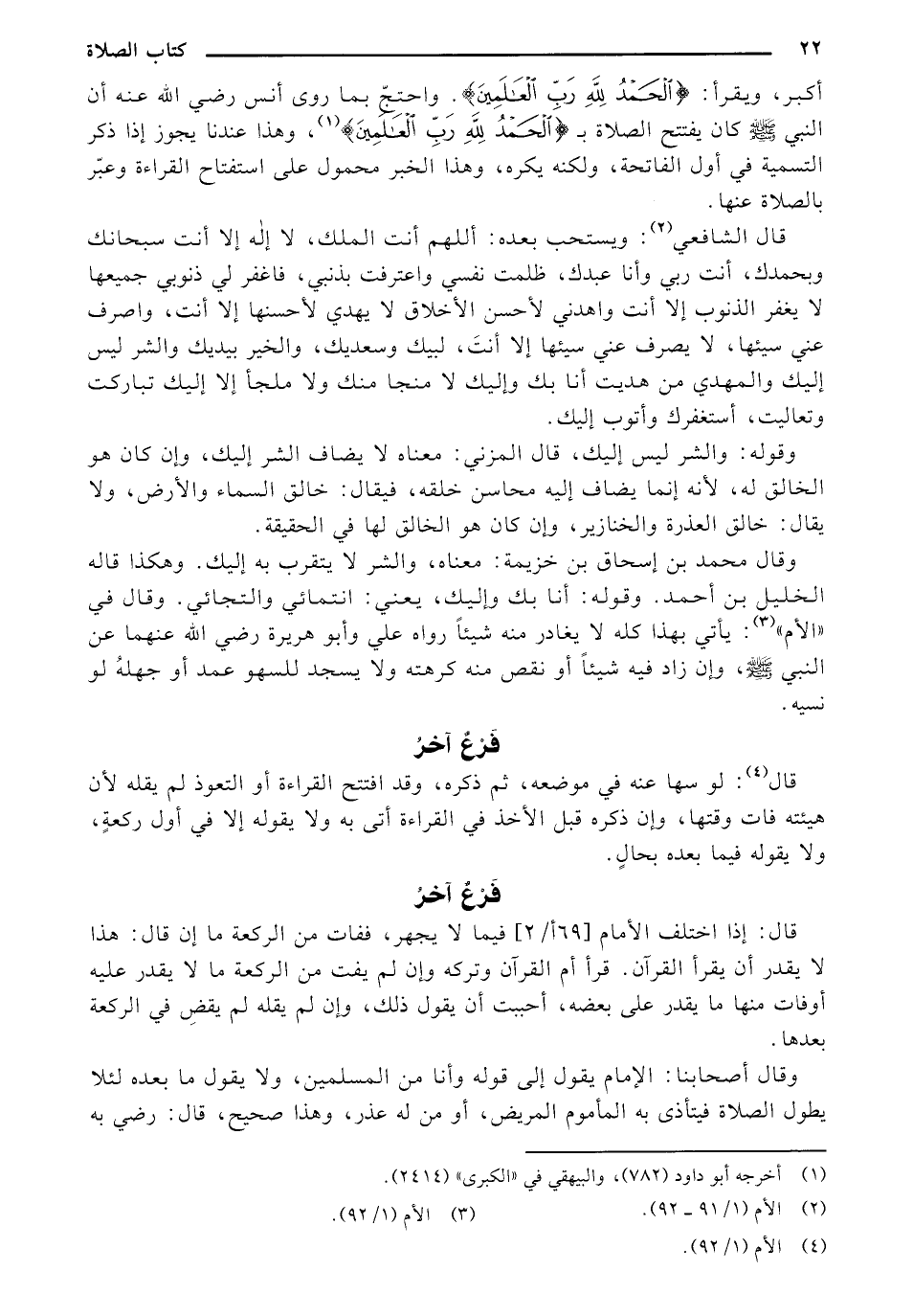 وقال محمد بن إسحاق بن خزيمة: معناه، والشر لا يتقرب به إليك. وهكذا قاله الخليل بن أحمد. وقوله: أنا بك وإليك، يعني: انتمائي والتجائي. وقال في (الأم): يأتي بهذا كله لا يغادر منه شيئًا رواه علي وأبو هريرة رضي الله عنه عن النبي - صلى الله عليه وسلم -، وإن زاد فيه شيئًا أو نقص منه كرهته ولا يسجد للسهو عمد أو جهلُة لو نسيه.