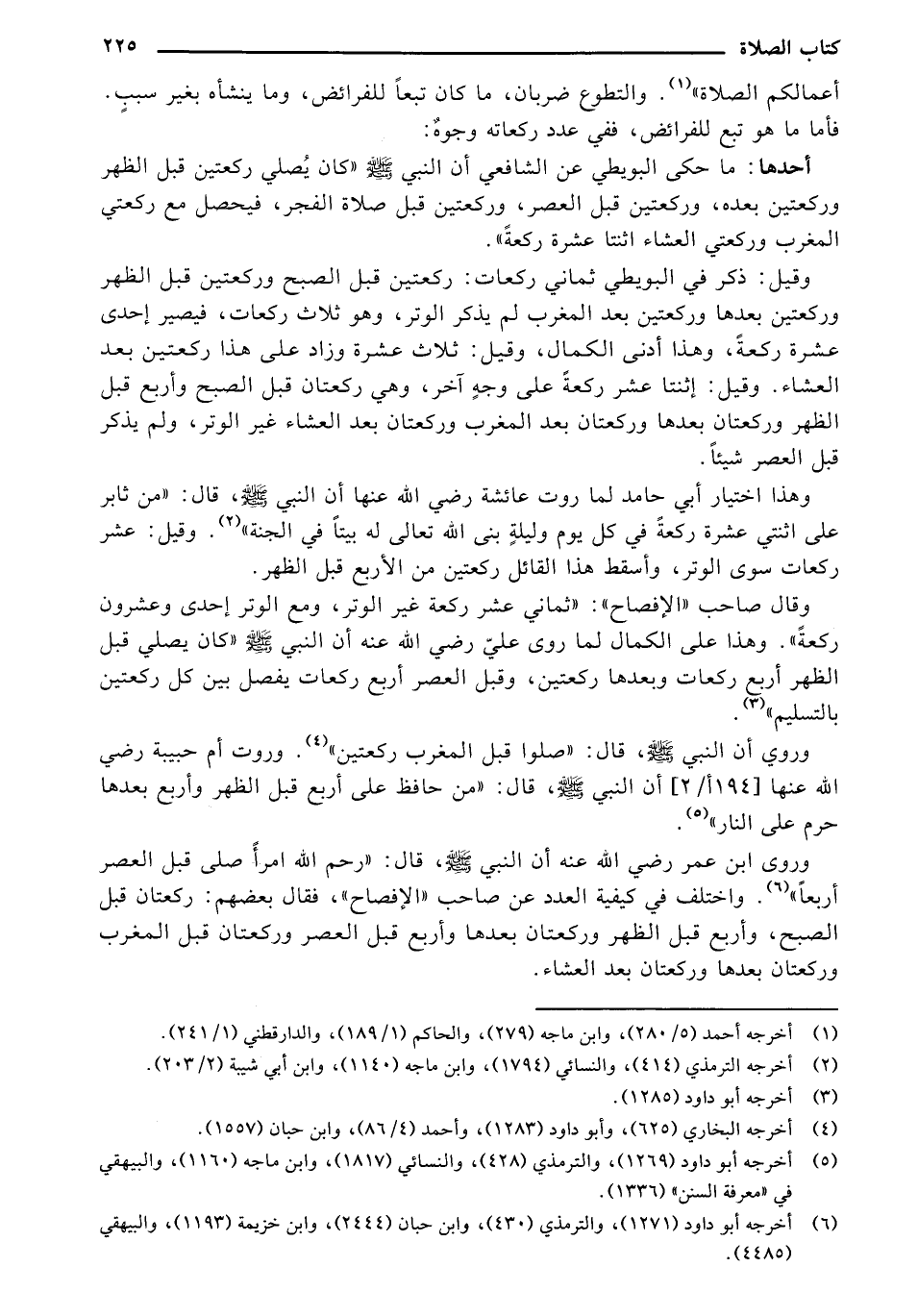 وروى ابن عمر رضي الله عنه أن النبي - صلى الله عليه وسلم -، قال: "رحم الله امرأ صلى قبل العصر أربعاً". واختلف في كيفية العدد عن صاحب "الإفصاح"، فقال بعضهم: ركعتان قبل الصبح، وأربع قبل الظهر وركعتان بعدها وأربع قبل العصر وركعتان قبل المغرب وركعتان بعدها وركعتان بعد العشاء.