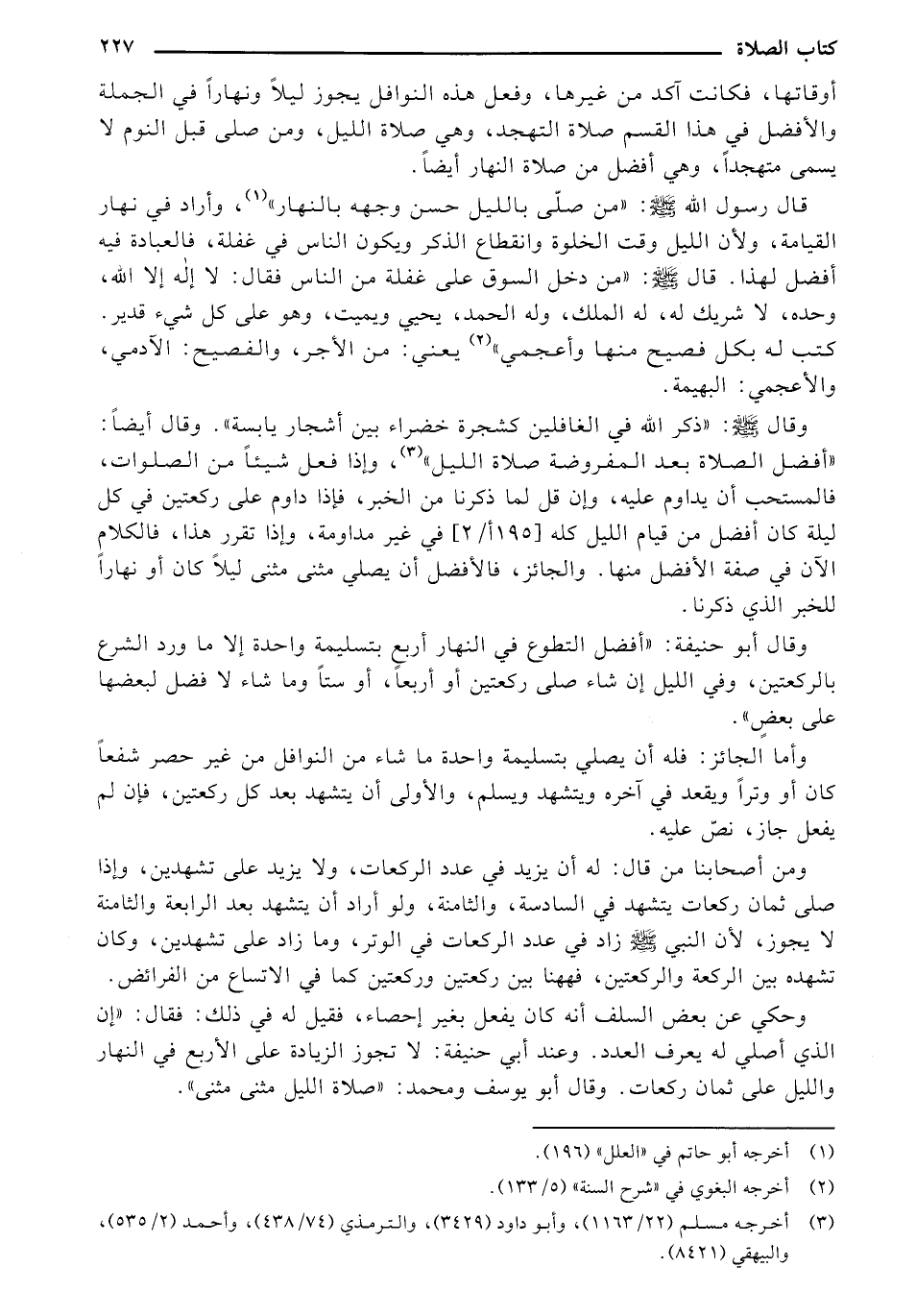 وقال أبو حنيفة: "أفضل التطوع في النهار أربع بتسليمة واحدة إلا ما ورد الشرع بالركعتين، وفي الليل إن شاء صلى ركعتين أو أربعاء أو ستاً وما شاء لا فضل لبعضها على بعض".