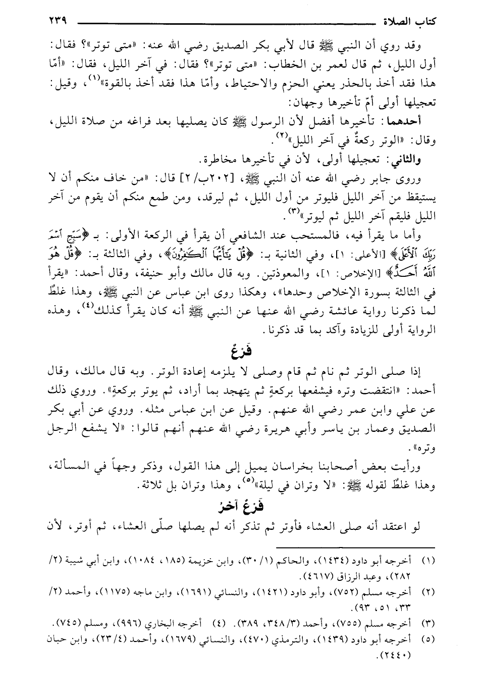 وقد روي أن النبي - صلى الله عليه وسلم - قال لأبي بكر الصديق رضي الله عنه: "متى توتر"؟ فقال: أول الليل، ثم قال لعمر بن الخطاب: "متى توتر"؟ فقال: في آخر الليل، فقال: "أما هذا فقد أخذ بالحذر يعني الحزم والاحتياط، وأما هذا فقد أخذ بالقوة"، وقيل: تعجيلها أولى أم تأخيرها وجهان: