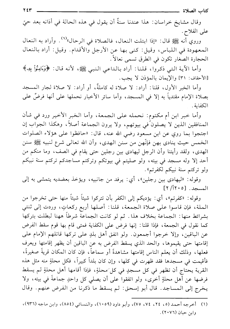 وأما الخبر الأول، قلنا: أراد: لا صلاة له كاملة، أو أراد: لا صلاة لجار المسجد بصلاة الإمام مقتدياً به إلا في المسجد، وأما سائر الأخبار نحملها على أنها فرض على الكفاية.