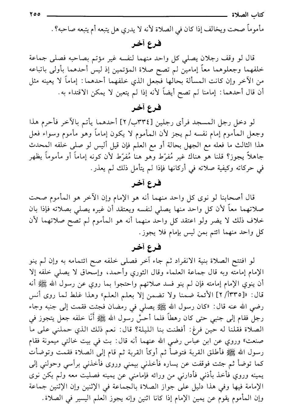 لو دخل رجل المسجد فرأى رجلين [334 ب/2] أحدهما يأتم بالأخر فأحرم هذا وجعل المأموم إمام نفسه لم يجز لأن المأموم لا يكون إماماً وهو مأموم وسواء فعل هذا الثالث ما فعله مع الجهل بحالة أو مع العلم فإن قيل أليس لو صلى خلفه المحدث جاهلاً يجوز؟ قلنا هو هناك غير مفرط وهو هنا مفرط لأن كونه إماماً أو مأموماً يظهر في حركاته وكيفية صلاته في أركانها فإذا لم يتأمل ذلك لم يعذر.