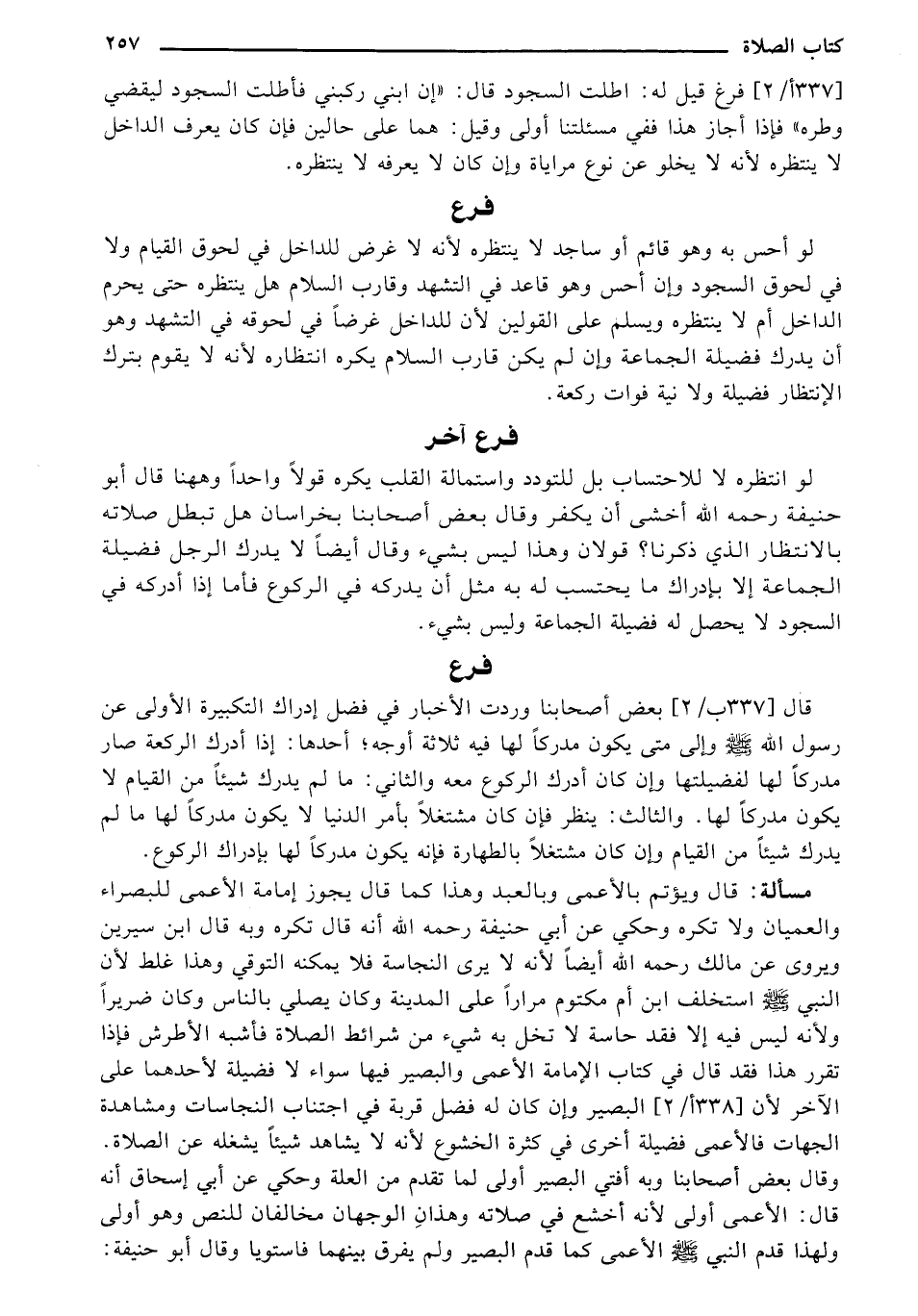 لو انتظره لا للاحتساب بل للتودد واستمالة القلب يكره قولاً واحداً وههنا قال أبو حنيفة رحمه الله أخشى أن يكفر وقال بعض أصحابنا بخراسان هل تبطل صلاته بالانتظار الذي ذكرنا؟ قولان وهذا ليس بشيء وقال أيضاً لا يدرك الرجل فضيلة الجماعة إلا بإدراك ما يحتسب له به مثل أن يدركه في الركوع فأما إذا أدركه في السجود لا يحصل له فضيلة الجماعة وليس بشيء.