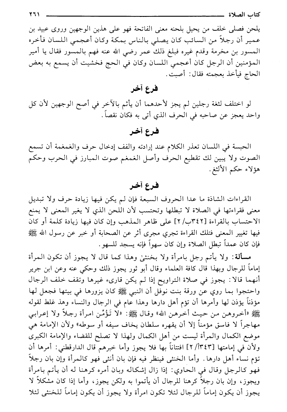 يلحن فصلى خلف من يحيل بلحنه معنى الفاتحة فهو على هذين الوجهين وروى عبيد بن عمير أن رجلاً من السائب كان يصلي بالناس بمكة وكان أعجمي اللسان فأخره المسور بن مخرمة وقدم غيره فبلغ ذلك عمر رضي الله عنه فهم بالمسور فقال يا أمير المؤمنين أن الرجل كان أعجمي اللسان وكان في الحج فخشيت أن يسمع به بعض الحاج فيأخذ بعجمته فقال: أصبت.