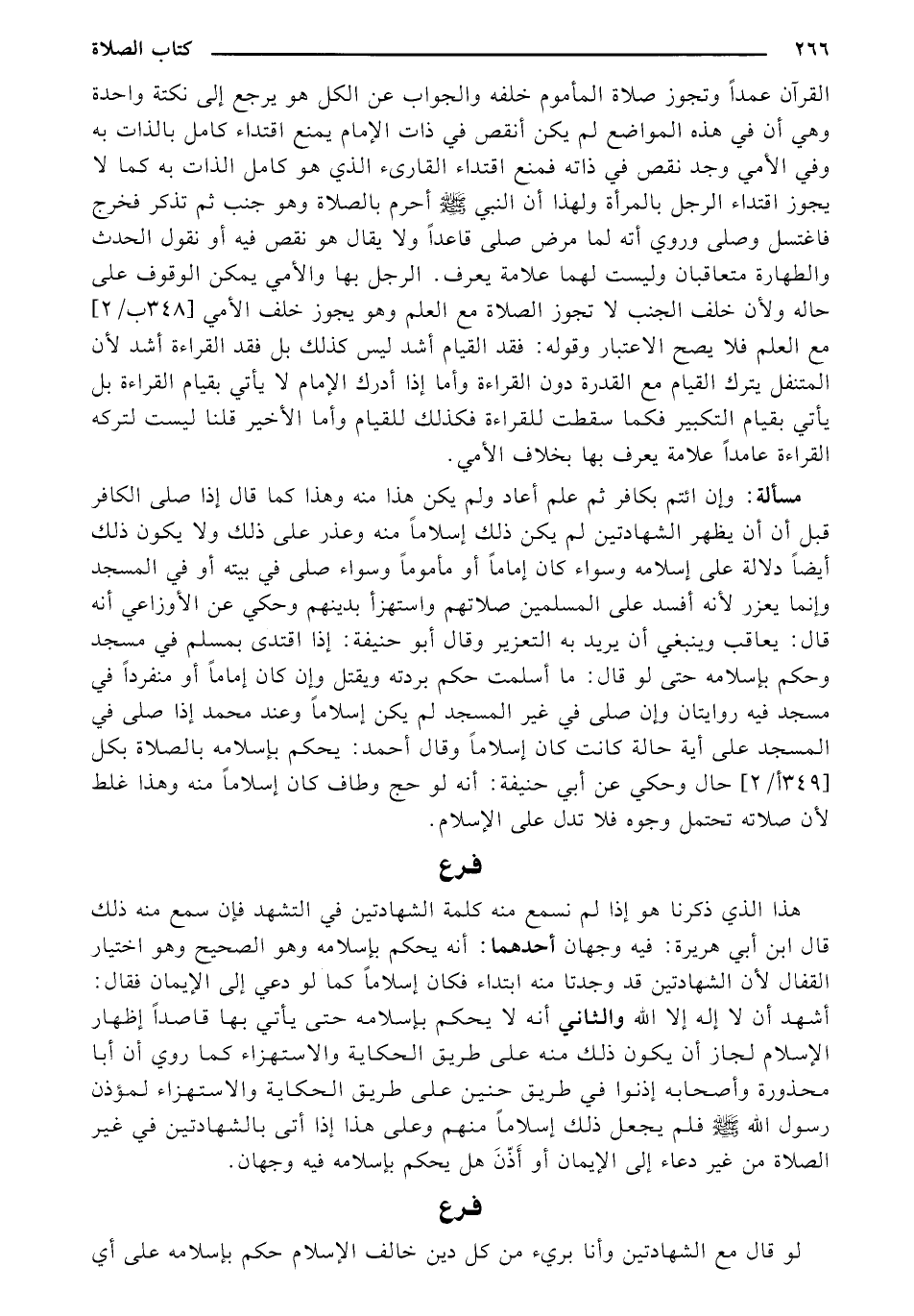 القرآن عمداً وتجوز صلاة المأموم خلفه والجواب عن الكل هو يرجع إلى نكتة واحدة وهي أن في هذه المواضع لم يكن أنقص في ذات الإمام يمنع اقتداء كامل بالذات به وفي الأمي وجد نقص في ذاته فمنع اقتداء القارئ الذي هو كامل الذات به كما لا يجوز اقتداء الرجل بالمرأة ولهذا أن النبي - صلى الله عليه وسلم - أحرم بالصلاة وهو جنب ثم تذكر فخرج فاغتسل وصلى وروي أنه لما مرض صلى قاعداً ولا يقال هو نقص فيه أو نقول الحدث والطهارة متعاقبان وليست لهما علامة يعرف. الرجل بها والأمي يمكن الوقوف على حاله ولأن خلف الجنب لا تجوز الصلاة مع العلم وهو يجوز خلف الأمي [348 ب/2] مع العلم فلا يصح الاعتبار وقوله: فقد القيام أشد ليس كذلك بل فقد القراءة أشد لأن المتنفل يترك القيام مع القدرة دون القراءة وأما إذا أدرك الإمام لا يأتي بقيام القراءة بل يأتي بقيام التكبير فكما سقطت للقراءة فكذلك للقيام وأما الأخير قلنا ليست لتركه القراءة عامداً علامة يعرف بها بخلاف الأمي.