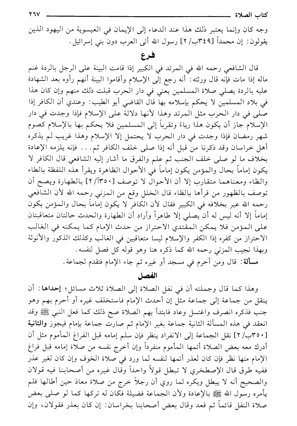 قال الشافعي رحمه الله في المرتد في الكبير إذا قامت البينة على الرجل بالردة غنم ماله إذا مات فإنه قال ورثته: أنه رجع إلى الإسلام وأقاموا البينة أنهم رأوه بعد الشهادة عليه بالردة يصلي صلاة المسلمين يعني في دار الحرب قبلت ذلك منهم وإن كان هذا في بلاد المسلمين لا يحكم بإسلامه بها قال القافي أبو الطيب: وعندي أن الكافر إذا صلى في دار الحرب مثل المرتد وهذا لأنها دلالة على الإسلام فإذا وجدت في دار الإسلام جاز أن يكون هذا رياء وتقرباً إلى المسلمين فلا يحكم بها بالإسلام كصوم شهر رمضان فإذا وجدت في دار الحرب لا يحتمل إلا الإسلام وهذا غريب لم يذكره أهل خراسان وقد ذكرنا من قبل أنه إذا صلى خلف الكافر ثم ... فإنه يلزمه الإعادة بخلاف ما لو صلى خلف الجنب ثم علم والفرق ما أشار إليه الشافعي قال الكافر لا يكون إماماً بحال والمؤمن يكون إماماً في الأحوال الظاهرة ويقرأ هذه اللفظة بالطاء والظاء ومعناهما متقارب إلا أن الأحوال لا توصف [350 أ/2] بالطهارة ويصح أن توصف بالظهور من قرأها بالظاء قال الخلل وقع من المزني رحمه الله لأن الشافعي رحمه الله عبر بخلافه في الكبير فقال لأن الكافر لا يكون إماماً بحال والمؤمن يكون إماماً إلا أنه ليس له أن يصلي إلا طاهراً وأراد أن الطهارة والحدث حالتان متعاقبتان على المؤمن فلا يمكن المقتدي الاحتراز من حدث الإمام كما يمكنه في الغالب الاحتراز من كفره إذا الكفر والإسلام ليسا متعاقبين في الغالب وكذلك الذكور والأنوثة وبهذا نجيب المزني رحمه الله كما ذكره هنا وهو قوله كل فصل لنفسه.