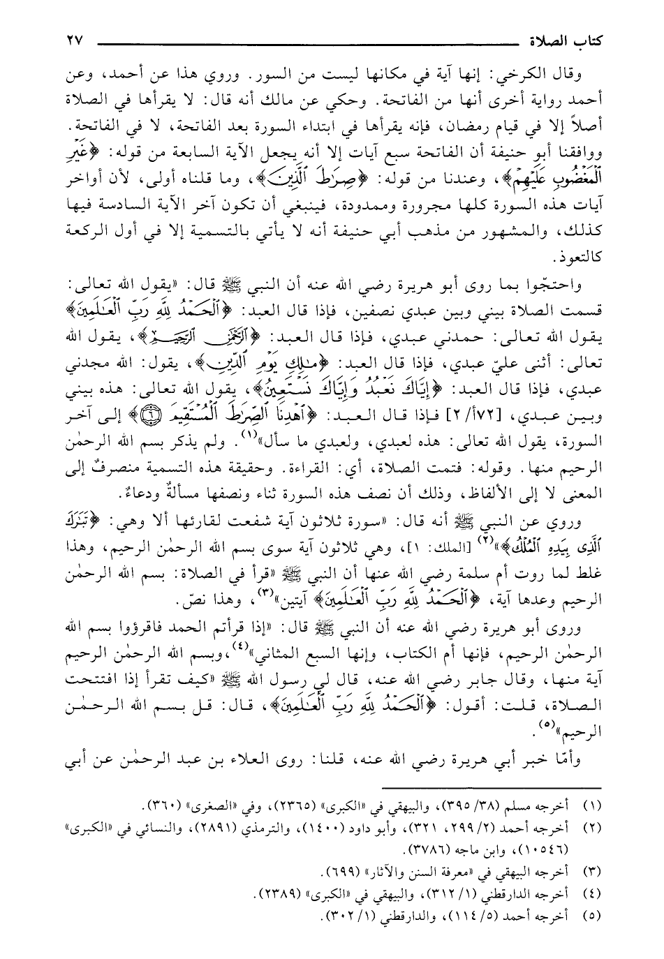 واحتجوا بما روى أبو هريرة رضي الله عنه أن النبي - صلى الله عليه وسلم - قال: (يقول الله تعالى: قسمت الصلاة بيني وبين عبدي نصفين، فإذا قال العبد: {الْحَمْدُ لِلَّهِ رَبِّ الْعَالَمِينَ} يقول الله تعالى: حمدني عبدي، فإذا قال العبد: {الرَّحْمَنِ الرَّحِيمِ}، يقول الله تعالى: أثنى علّي عبدي، فإذا قال العبد: {مَالِكِ يَوْمِ الدِّينِ}، يقول: الله مجدني عبدي، فإذا قال العبد: {إِيَّاكَ نَعْبُدُ وَإِيَّاكَ نَسْتَعِينُ}، يقول الله تعالى: هذه بيني وبين عبدي، [72 أ/ 2] فإذا قال العبد: {اهْدِنَا الصِّرَاطَ الْمُسْتَقِيمَ} إلى آخر السورة، يقول الله تعالى: هذه لعبدي، ولعبدي ما سأل). ولم يذكر بسم الله الرحمن الرحيم منها. وقوله: فتمت الصلاة، أي: القراءة. وحقيقة هذه التسمية منصرٌف إلى المعنى لا إلى الألفاظ، وذلك أن نصف هذه السورة ثناء ونصفها مسالٌة ودعاٌء.