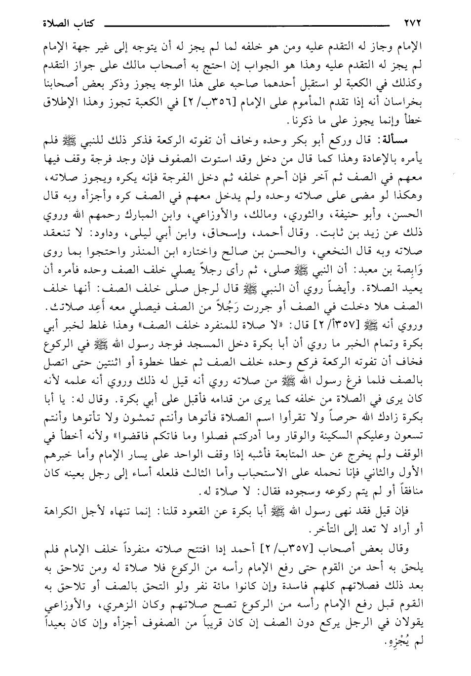 الإمام وجاز له التقدم عليه ومن هو خلفه لما لم يجز له أن يتوجه إلى غير جهة الإمام لم يجز له التقدم عليه وهذا هو الجواب إن احتج به أصحاب مالك على جواز التقدم وكذلك في الكعبة لو استقبل أحدهما صاحبه على هذا الوجه يجوز وذكر بعض أصحابنا بخراسان أنه إذا تقدم المأموم على الإمام [356 ب/2] في الكعبة تجوز وهذا الإطلاق خطأ وإنما يجوز على ما ذكرنا.