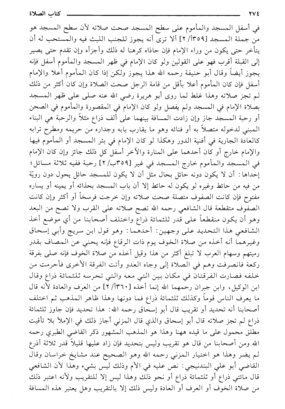 في أسفل المسجد والمأموم على سطح المسجد صحت صلاته لأن سطح المسجد هو من جملة المسجد [359 أ/2] ألا ترى أنه يجوز للجنب اللبث فيه والمستحب له أن يتأخر حتى يكون من وراء الإمام فإن حاذاه كرهنا له ذلك وأجزأه وإن تقدم حتى يصير إلى القبلة أقرب فهو على القولين ولو كان الإمام في ظهر المسجد والمأموم أسفل فإنه يجوز أيضاً وقال أبو حنيفة رحمه الله هذا يجوز ولكن إذا كان المأموم أعلا والإمام أسفل فإن كان المأموم أعلا بأقل من قامة الرجل صحت الصلاة وإن كان أكثر من ذلك لم تجز صلاته وهذا غلط لما روى أبو هريرة رضي الله عنه صلى على ظهر المسجد بصلاة الإمام في المسجد ولم يفصل ولو كان الإمام في المقصورة والمأموم في الصحن أو رحبة المسجد جاز وإن زادت المسافة بينهما على ألف ذراع مثلاً والرحبة هي البناء المبني لدخوله متصلاً به أو فنائه وهو ما يقارب بابه وجداره من حريمه ومطرح ترابه كالعادة الجارية في أفنية الدور وهكذا لو كان الإمام في بئر المسجد أو المأموم فيها والإمام خارج أو كان أحدهما على المنارة والآخر أسفل كل ذلك جائز وإن كان الإمام في المسجد والمأموم خارج المسجد في غير [359 ب/2] رحبة ففيه ثلاثة مسائل؛ إحداها: أن لا يكون دونه حائل بحال مثل أن لا يكون للمسجد حائل يحول دون روية من فيه من حائط وغيره لو يكون له حائط إلا أن باب المسجد بحذائه أو يمينه أو يساره مفتوح فإن كانت الصفوف متصلة صحت صلاته وإن خرجت فرسخاً أو أكثر وإن كانت الصفوف متقطعة قال الشافعي رحمه الله تصح صلاته على القرب ولا تصح من البعد وهو أن يكون منقطعاً على قدر ثلثمائة ذراع واختلف أصحابنا من أي موضع أخذ الشافعي هذا التحديد على وجهين: أحدهما: وهو قول ابن سريج وأبي إسحاق وغيرهما أنه أخذه من صلاة الخوف يوم ذات الرقاع فإنه يحني عن المصاف بقدر رميتهم وسهام العرب لا تبلغ أكثر من هذا وقيل أخذه من صلاة الخوف فإنه صلى بفرقة ركعة فانصرفت وهم في الصلاة إلى وجاه العدو وأتت الفرقة الأخرى فأحرمت من خلفه فصارت الفرقتان في مكان بين التي معه والتي تحرسه ثلثمائة ذراع وقال ابن الوكيل، وابن جبران رحمهما الله إنما أخذه [360 أ/2] من العرف والعادة لأنه قال ما يعرف الناس قوماً وكذلك ثلثمائة ذراع فما دونها وهذا ظاهر المذهب ثم اختلف أصحابنا أنه تحديد أو تقريب قال أبو إسحاق رحمه الله: هذا تحديد فإن جاوز ثلثمائة ذراع لم تجز صلاته قال أبو إسحاق والذي قال المزني أجاز ذلك في الإملأ بلا تأقيت مطلق محمول على ما قيده ههنا وهذا هو المذهب المشهور ذكر القاضي الطبري رحمه الله ومن أصحابنا من قال هو تقريب وليس بتحديد فإن زاد عليها قليلاً قدر ثلاثة أذرع لم يضر وهذا هو اختيار المزني رحمه الله وهو الصحيح عند مشايخ خراسان وقال القاضي أبو علي البندنيجي: نص عليه في الأم وذلك ليس بشيء وهذا لأن الشافعي قال مائتي ذراع أو ثلثمائة ذراع أو نحو ذلك وهذا ليس إلا للتقريب ولأنه اعتبر ذلك من صلاة الخوف أو العرف أو العادة وليس ذلك إلا بالتقريب وهل يعتبر هذه المسافة