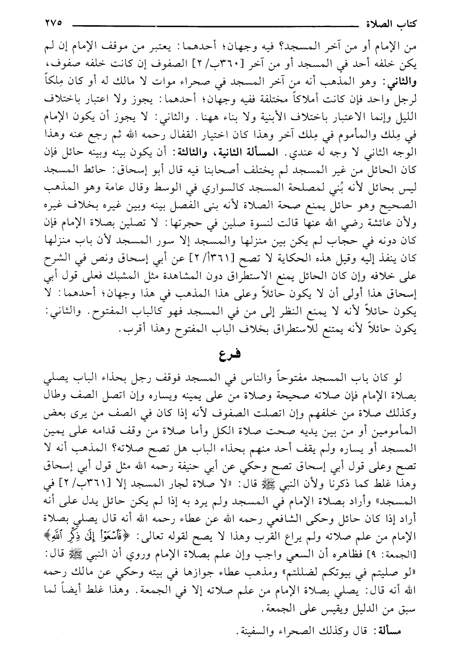 من الإمام أو من آخر المسجد؟ فيه وجهان؛ أحدهما: يعتبر من موقف الإمام إن لم يكن خلفه أحد في المسجد أو من آخر [360 ب/2] الصفوف إن كانت خلفه صفوف، والثاني: وهو المذهب أنه من آخر المسجد في صحراء موات لا مالك له أو كان ملكاً لرجل واحد فإن كانت أملاكاً مختلفة ففيه وجهان؛ أحدهما: يجوز ولا اعتبار باختلاف الليل وإنما الاعتبار باختلاف الأبنية ولا بناء ههنا. والثاني: لا يجوز أن يكون الإمام في ملك والمأموم في ملك آخر وهذا كان اختيار القفال رحمه الله ثم رجع عنه وهذا الوجه الثاني لا وجه له عندي. المسألة الثانية، والثالثة: أن يكون بينه وبينه حائل فإن كان الحائل من غير المسجد لم يختلف أصحابنا فيه قال أبو إسحاق: حائط المسجد ليس بحائل لأنه بني لمصلحة المسجد كالسواري في الوسط وقال عامة وهو المذهب الصحيح وهو حائل يمنع صحة الصلاة لأنه بني الفصل بينه وبين غيره بخلاف غيره ولأن عائشة رضي الله عنها قالت لنسوة صلين في حجرتها: لا تصلين بصلاة الإمام فإن كان دونه في حجاب لم يكن بين منزلها والمسجد إلا سور المسجل لأن باب منزلها كان ينفذ إليه وقيل هذه الحكاية لا تصح [361 أ/2] عن أبي إسحاق ونص في الشرح على خلافه وإن كان الحائل يمنع الاستطراق دون المشاهدة مثل المشبك فعلى قول أبي إسحاق هذا أولى أن لا يكون حائلاً وعلى هذا المذهب في هذا وجهان؛ أحدهما: لا يكون حائلاً لأنه لا يمنع النظر إلى من في المسجد فهو كالباب المفتوح. والثاني: يكون حائلاً لأنه يمتنع للاستطراق بخلاف الباب المفتوح وهذا أقرب.