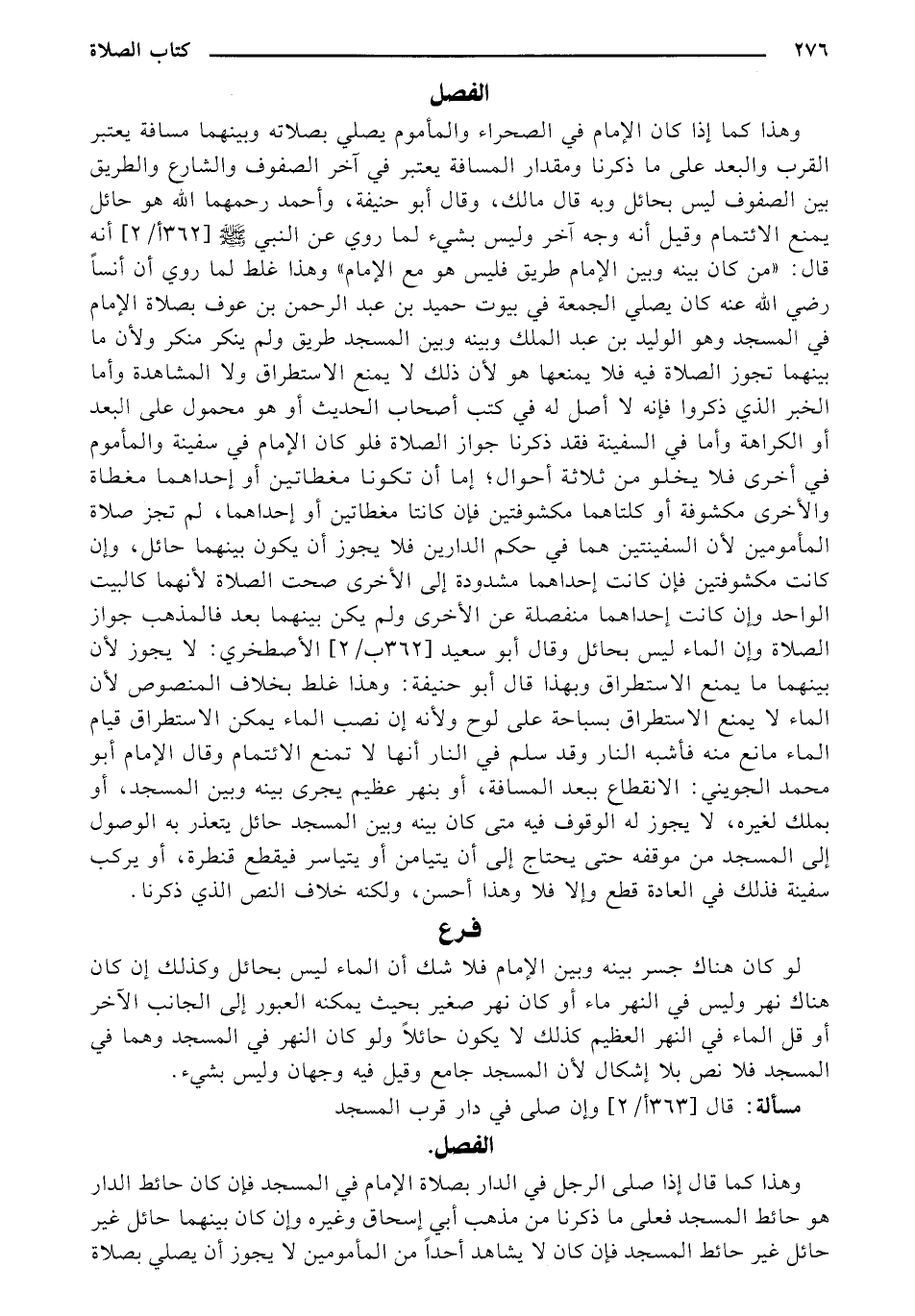 وهذا كما إذا كان الإمام في الصحراء والمأموم يصلي بصلاته وبينهما مسافة يعتبر القرب والبعد على ما ذكرنا ومقدار المسافة يعتبر في أخر الصفوف والشارع والطريق بين الصفوف ليس بحائل وبه قال مالك، وقال أبو حنيفة، وأحمد رحمهما الله هو حائل يمنع الائتمام وقيل أنه وجه آخر وليس بشيء لما روي عن النبي - صلى الله عليه وسلم -[362 أ/2] أنه قال: "من كان بينه وبين الإمام طريق فليس هو مع الإمام" وهذا غلط لما روي أن أنساً رضي الله عنه كان يصلي الجمعة في بيوت حميد بن عبد الرحمن بن عوف بصلاة الإمام في المسجد وهو الوليد بن عبد الملك وبينه وبين المسجد طريق ولم ينكر منكر ولأن ما بينهما تجوز الصلاة فيه فلا يمنعها هو لأن ذلك لا يمنع الاستطراق ولا المشاهدة وأما الخبر الذي ذكروا فإنه لا أصل له في كتب أصحاب الحديث أو هو محمول على البعد أو الكراهة وأما في السفينة فقد ذكرنا جواز الصلاة فلو كان الإمام في سفينة والمأموم في أخرى فلا يخلو من ثلاثة أحوال؛ إما أن تكونا مغطاتين أو إحداهما مغطاة والأخرى مكشوفة أو كلتاهما مكشوفتين فإن كانتا مغطاتين أو إحداهما، لم تجز صلاة المأمومين لأن السفينتين هما في حكم الدارين فلا يجوز أن يكون بينهما حائل، وإن كانت مكشوفتين فإن كانت إحداهما مشدودة إلى الأخرى صحت الصلاة لأنهما كالبيت الواحد وإن كانت إحداهما منفصلة عن الأخرى ولم يكن بينهما بعد فالمذهب جواز الصلاة وإن الماء ليس بحائل وقال أبو سعيد [362 ب/2] الأصطخري: لا يجوز لأن بينهما ما يمنع الاستطراق وبهذا قال أبو حنيفة: وهذا غلط بخلاف المنصوص لأن الماء لا يمنع الاستطراق بسباحة على لوح ولأنه إن نصب الماء يمكن الاستطراق قيام الماء مانع منه فأشبه النار وقد سلم في النار أنها لا تمنع الائتمام وقال الإمام أبو محمد الجويني: الانقطاع ببعد المسافة، أو بنهر عظيم يجرى بينه وبين المسجد، أو بملك لغيره، لا يجوز له الوقوف فيه متى كان بينه وبين المسجد حائل يتعذر به الوصول إلى المسجد من موقفه حتى يحتاج إلى أن يتيامن أو يتياسر فيقطع قنطرة، أو يركب سفينة فذلك في العادة قطر وإلا فلا وهذا أحسن، ولكنه خلاف النص الذي ذكرنا.