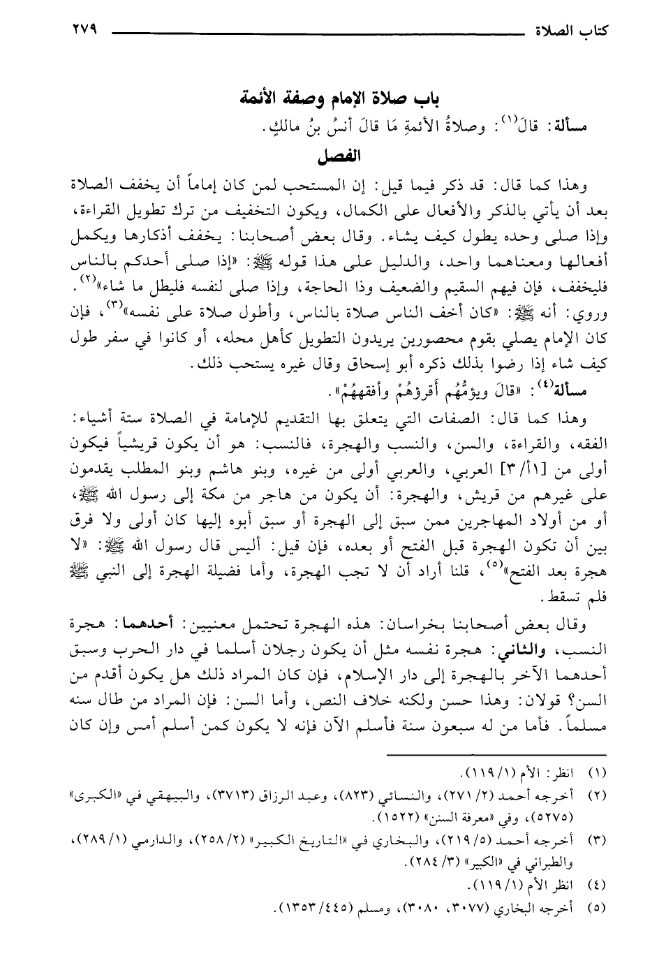 وهذا كما قال: الصفات التي يتعلق بها التقديم للإمامة في الصلاة سنة أشياء: الفقه، والقراءة، والسن، والنسب والهجرة، فالنسب: هو أن يكون قريشياً فيكون أولى من [1 أ/3] العربي، والعربي أولى من غيره، وبنو هاشم وبنو المطلب يقدمون على غيرهم من قريش، والهجرة: أن يكون من هاجر من مكة إلى رسول الله - صلى الله عليه وسلم -، أو من أولاد المهاجرين ممن سبق إلى الهجرة أو سبق أبوه إليها كان أولى ولا فرق بين أن تكون الهجرة قبل الفتح أو بعده، فإن قيل: أليس قال رسول الله - صلى الله عليه وسلم -: "لا هجرة بعد الفتح"، قلنا أراد أن لا تجب الهجرة، وأما فضيلة الهجرة إلى النبي - صلى الله عليه وسلم - فلم تسقط.