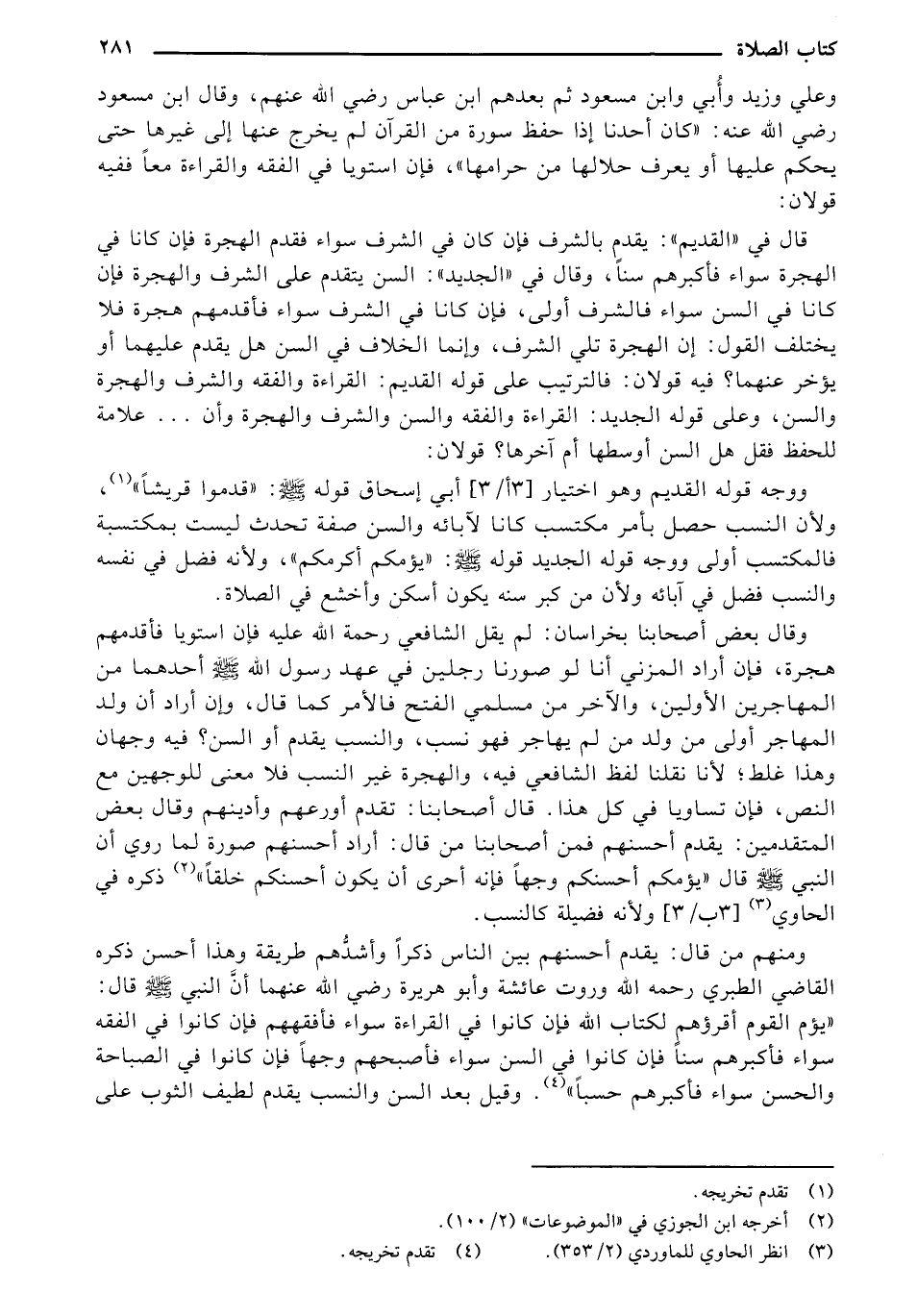 ووجه قوله القديم وهو اختيار [3 أ/3] أبي إسحاق قوله - صلى الله عليه وسلم -: "قدموا قريشاً"، ولأن النسب حصل بأمر مكتسب كانا لآبائه والسن صفة تحدث ليست بمكتسبة فالمكتسب أولى ووجه قوله الجديد قوله - صلى الله عليه وسلم -: "يؤمكم أكرمكم"، ولأنه فضل في نفسه والنسب فضل في آبائه ولأن من كبر سنه يكون أسكن وأخشع في الصلاة.