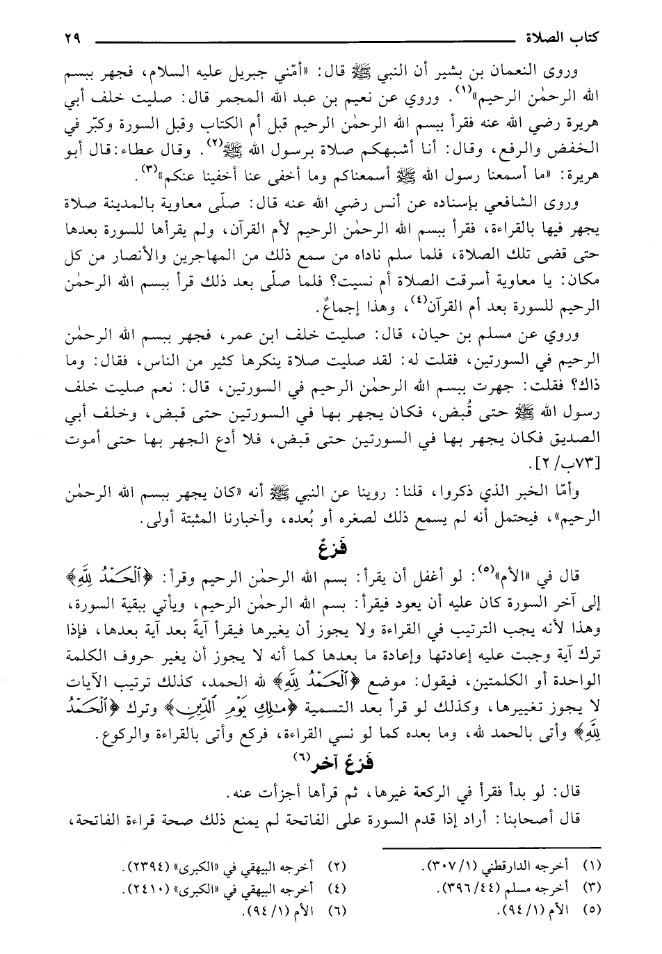 وروي عن مسلم بن حيان، قال: صليت خلف ابن عمر، فجهر ببسم الله الرحمن الرحيم في السورتين، فقلت له: لقد صليت صلاة ينكرها كثير من الناس، فقال: وما ذاك؟ فقلت: جهرت ببسم الله الرحمن الرحيم في السورتين، قال: نعم صليت خلف رسول الله - صلى الله عليه وسلم - حتى ُقبض، فكان يجهر بها في السورتين حتى قبض، وخلف أبى الصديق فكان يجهر بها في السورتين حتى قبض، فلا أدع الجهر بها حتى أموت [73/ ب].