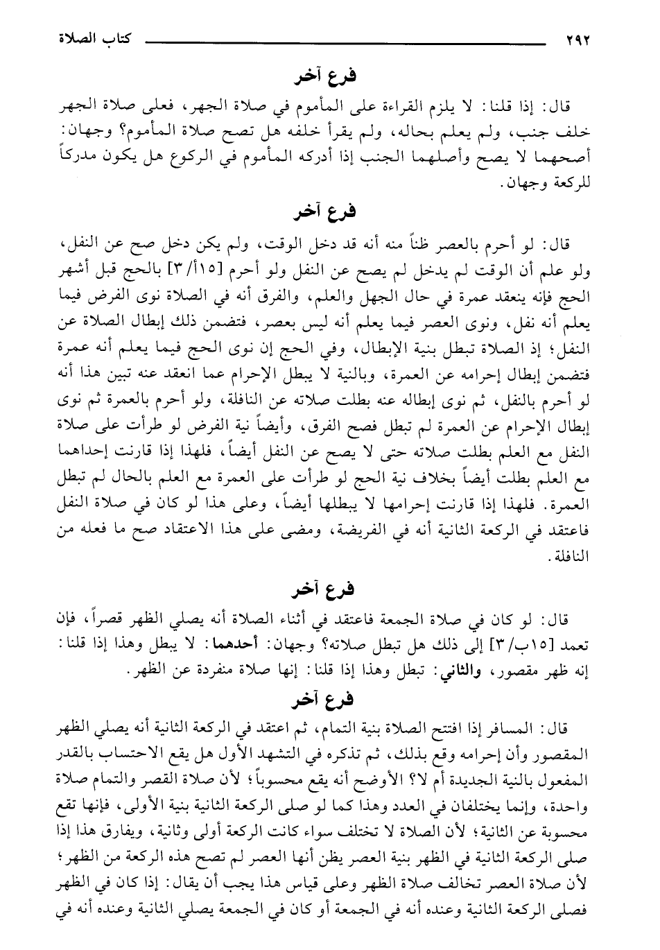 قال: المسافر إذا افتتح الصلاة بنية التمام، ثم اعتقد في الركعة الثانية أنه يصلي الظهر المقصور وأن إحرامه وقع بذلك، ثم تذكره في التشهد الأول هل يقع الاحتساب بالقدر المفعول بالنية الجديدة أم لا؟ الأوضح أنه يقع محسوباً؛ لأن صلاة القصر والتمام صلاة واحدة، وإنما يختلفان في العدد وهذا كما لو صلى الركعة الثانية بنية الأولى، فإنها تقع محسوبة عن الثانية؛ لأن الصلاة لا تختلف سواء كانت الركعة أولى وثانية، ويفارق هذا إذا صلى الركعة الثانية في الظهر بنية العصر يظن أنها العصر لم تصح هذه الركعة من الظهر: لأن صلاة العصر تخالف صلاة الظهر وعلى قياس هذا يجب أن يقال: إذا كان في الظهر فصلى الركعة الثانية وعنده أنه في الجمعة أو كان في الجمعة يصلي الثانية وعنده أنه في