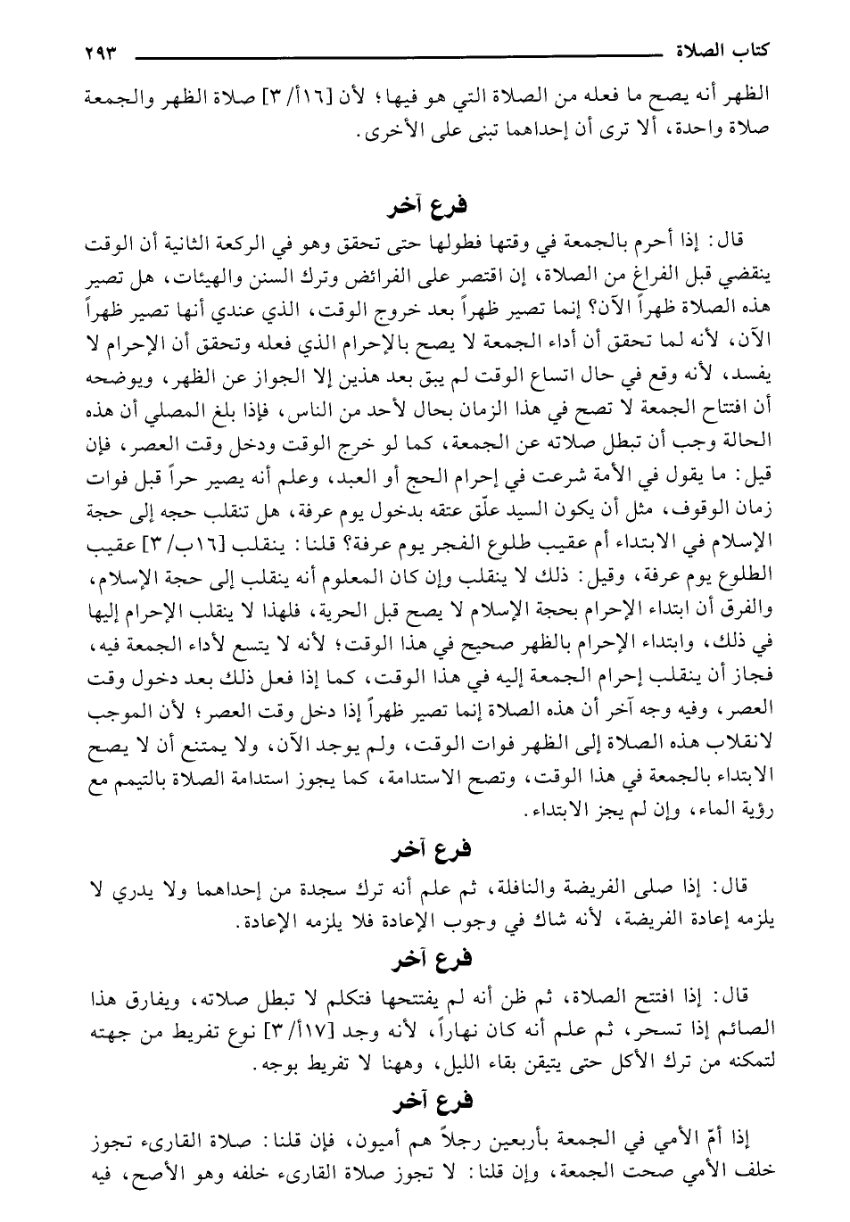 قال: إذا أحرم بالجمعة في وقتها فطولها حتى تحقق وهو في الركعة الثانية أن الوقت ينقضي قبل الفراغ من الصلاة، إن اقتصر على الفرائض وترك السنن والهيئات، هل تصير هذه الصلاة ظهراً الآن؟ إنما تصير ظهراً بعد خروج الوقت، الذي عندي أنها تصير ظهراً الآن، لأنه لما تحقق أن أداء الجمعة لا يصح بالإحرام الذي فعله وتحقق أن الإحرام لا يفسد، لأنه وقع في حال اتساع الوقت لم يبق بعد هذين إلا الجواز عن الظهر، ويوضحه أن افتتاح الجمعة لا تصح في هذا الزمان بحال لأحد من الناس، فإذا بلغ المصلي أن هذه الحالة وجب أن تبطل صلاته عن الجمعة، كما لو خرج الوقت ودخل وقت الحصر، فإن قيل: ما يقول في الأمة شرعت في إحرام الحج أو العبد، وعلم أنه يصير حراً قبل فوات زمان الوقوف، مثل أن يكون السيد علق عتقه بدخول يوم عرفة، هل تنقلب حجه إلى حجة الإسلام في الابتداء أم عقيب طلوع الفجر يوم عرفة؟ قلنا: ينقلب [16 ب/3] عقيب الطلوع يوم عرفة، وقيل: ذلك لا ينقلب وإن كان المعلوم أنه ينقلب إلى حجة الإسلام، والفرق أن ابتداء الإحرام بحجة الإسلام لا يصح قبل الحرية، فلهذا لا ينقلب الإحرام إليها في ذلك، وابتداء الإحرام بالظهر صحيح في هذا الوقت؛ لأنه لا يتسع لأداء الجمعة فيه، فجاز أن ينقلب إحرام الجمعة إليه في هذا الوقت، كما إذا فعل ذلك بعد دخول وقت العصر، وفيه وجه أخر أن هذه الصلاة إنما تصير ظهراً إذا دخل وقت العصر، لأن الموجب لانقلاب هذه الصلاة إلى الظهر فوات الوقت، ولم يوجد الآن، ولا يمتنع أن لا يصح الابتداء بالجمعة في هذا الوقت، وتصح الاستدامة، كما يجوز استدامة الصلاة بالتيمم مع رؤية الماء، وإن لم يجز الابتداء.