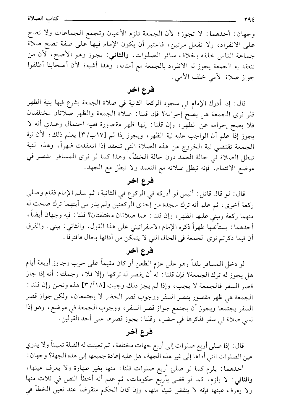 قال: إذا أدرك الإمام في سجود الركعة الثانية في صلاة الجمعة شرع فيها بنية الظهر فلو نوى الجمعة هل يصح إحرامه؟ فإن قلنا: صلاة الجمعة والظهر صلاتان مختلفتان فلا يصح إحرامه عن الظهر، وإن قلنا: إنها ظهر مقصورة ففيه احتمال وعندي أنه لا يجوز إذا علم أن الواجب عليه نية الظهر، ويجوز إذا لم [17 ب/3] يعلم ذلك؛ لأن نية الجمعة تقتضي نية الخروج من هذه الصلاة التي تنعقد إذا انعقدت ظهراً، وهذه النية تبطل الصلاة في حالة العمد دون حالة الخطأ، وهذا كما لو نوى المسافر القصر في موضع الائتمام، فإنه تبطل صلاته مع التعمد ولا تبطل مع الجهد.
