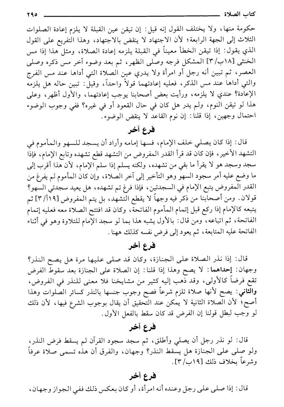 حكومة منها، ولا يختلف القول إنه قيل: إن تيقن عين القبلة لا يلزم إعادة الصلوات الثلاث إلى الجهة الرابعة؛ لأن الاجتهاد لا ينقض بالاجتهاد، وهذا التفريع على القول الذي يقول: إذا تيقن الخطأ معيناً في القبلة يلزمه إعادة الصلاة، ومثل هذا إذا مس الخنثى [18 ب/3] المشكل فرجه وصلى الظهر، ثم بعد وضوء آخر مس ذكره وصلى العصر، ثم تبين أنه رجل أو امرأة ولا يدري عين الصلاة التي أداها عند مس الفرج والتي أداها عند مس الذكر، فعليه إعادتهما قولاً واحداً، وقيل: تبين حاله هل يلزمه الإعادة؟ عندي لا يلزمه، ورأيت بعض أصحابنا يوجب إعادتهما، والأول أظهر، وعلى هذا لو تيقن النوم، ولم يدر هل كان في حال القعود أو في غيره؟ ففي وجوب الوضوء احتمال وجهين، إذا قلنا: إن نوم القاعد لا ينقض الوضوء.