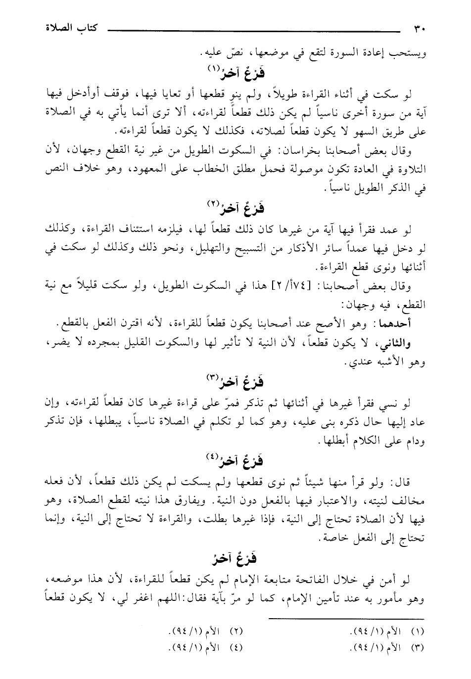 قال: ولو قرأ منها شيئًا ثم نوى قطعها ولم يسكت لم يكن ذلك قطعًا، لأن فعله مخالف لنيته، والاعتبار فيها بالفعل دون النية، ويفارق هذا نيته لقطع الصلاة، وهو فيها لأن الصلاة تحتاج إلى النية، فإذا غيرها بطلت، والقراءة لا تحتاج إلى النية، وإنما تحتاج إلى الفعل خاصة.