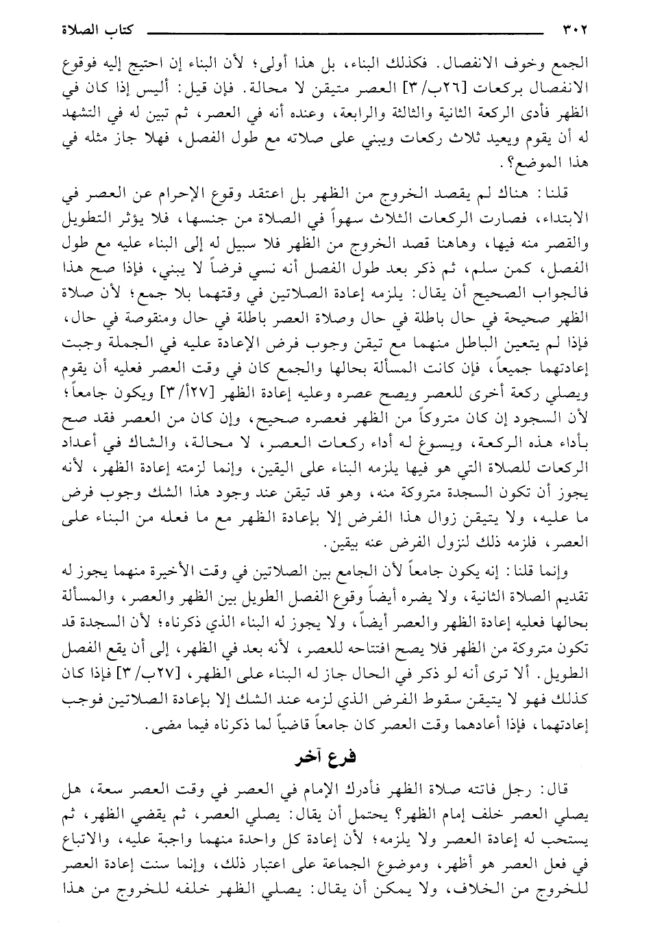 قلنا: هناك لم يقصد الخروج من الظهر بل اعتقا وقه ع الإحرام عن العصر في الابتداء، فصارت الركعات الثلاث سهواً في الصلاة من جنسها، فلا يؤثر التطويل والقصر منه فيها، وهاهنا قصا الخروج من الظهر فلا سبيل له إلى البناء عليه مع طول الفصل، كمن سلم، ثم ذكر بعد طول الفصل أنه نسي فرضاً لا يبني، فإذا صح هذا فالجواب الصحيح أن يقال: يلزمه إعادة الصلاتين في وقتهما بلا جمع؛ لأن صلاة الظهر صحيحة في حال باطلة في حال وصلاة العصر باطلة في حال ومنقوصة في حال، فإذا لم يتعين الباطل منهما مع تيقن وجوب فرض الإعادة عليه في الجملة وجبت إعادتهما جميعاً، فإن كانت المسألة بحالها والجمع كان في وقت العصر فعليه أن يقوم ويصلي ركعة أخرى للعصر ويصح عصره وعليه إعادة الظهر [27 أ / 3] ويكون جامعاً: لأن السجود إن كان متروكا من الظهر فعصره صحيح، وإن كان من العصر فقد صح بأداء هذه الركعة، ويسوغ له أداء ركعات العصر، لا محالة، والشاك في أعداد الركعات للصلاة التي هو فيها يلزمه البناء على اليقين، وإنما لزمته إعادة الظهر، لأنه يجوز أن تكون السجدة متروكة منهء وهو قا تيقن عند وجود هذا الشك وجوب فرض ما عليه، ولا يتيقن زوال هذا الغرض إلا بإعادة الظهر مع ما فعله من البناء على العصر، فلزمه ذلك لنزول الفرض عنه بيقين.