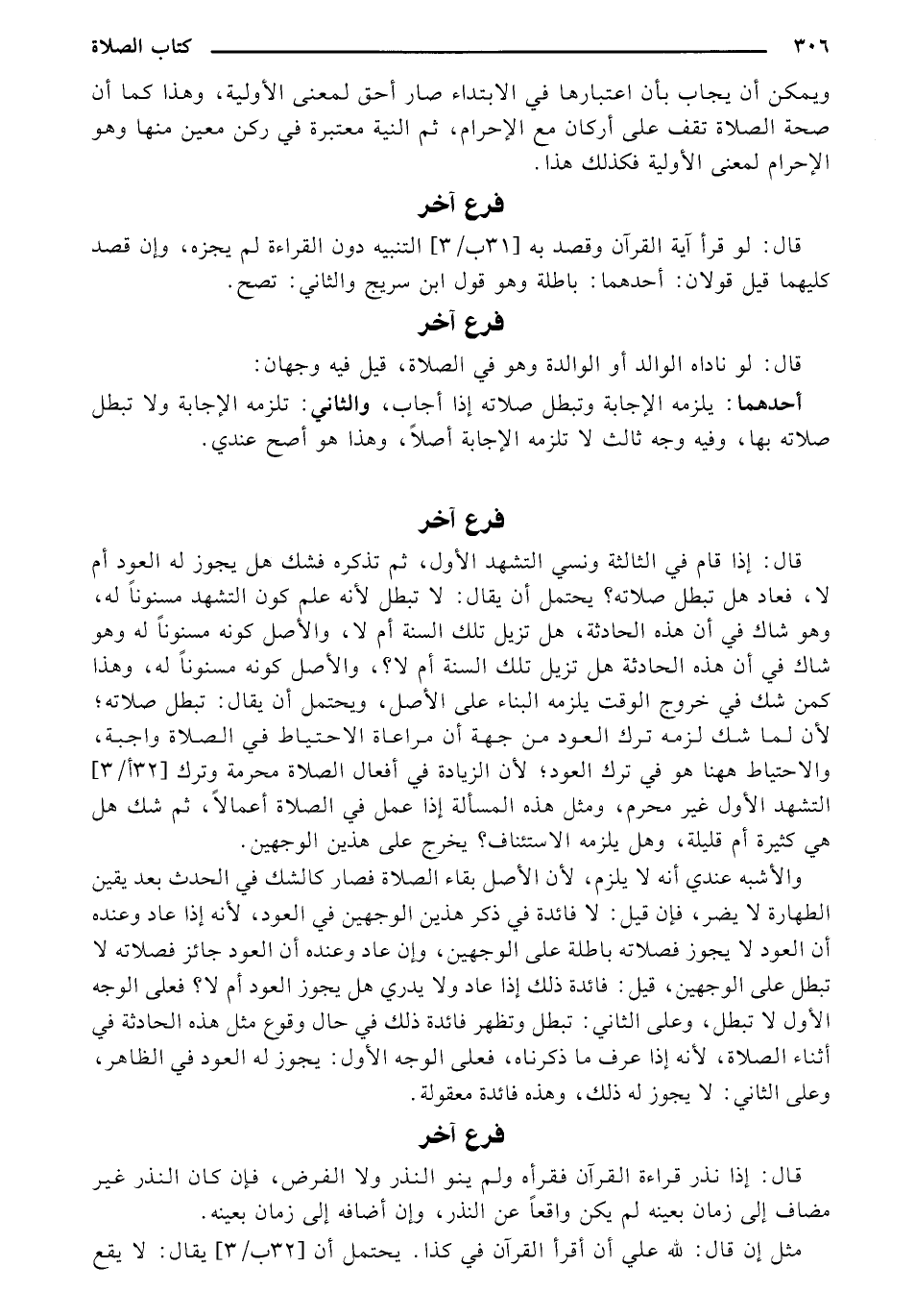 والأشبه عندي أنه لا يلزم، لأن الأصل بقاء الصلاة نصار كالشك في الحدث بعد يقين الطهارة لا يضر، فإن قيل: لا فائدة في ذكر هذين الوجهين في العود، لأنه إذا عاد وعنده أن العود لا يجوز فصلاته باطلة على الوجهين، وإن عاد وعنده أن العود جائز فصلاته لا تطل على الوجهين، قيل: فائدة ذلك إذا هاد ولا يدري هل يجوز العود أم لا؟ فعلى الوجه الأول لا تبطل، وعلى الثاني: تبطل وتظهر فائدة ذلك ني حال وقوع مثل هذه الحادثة في أثناء الصلاة، لأنه إذا عرف ما ذكرناه، نعلى الوجه الأول: يجوز له العود في الظاهر، وعلى الثاني: لا يجوز له ذلك، وهذه فائدة معقولة.