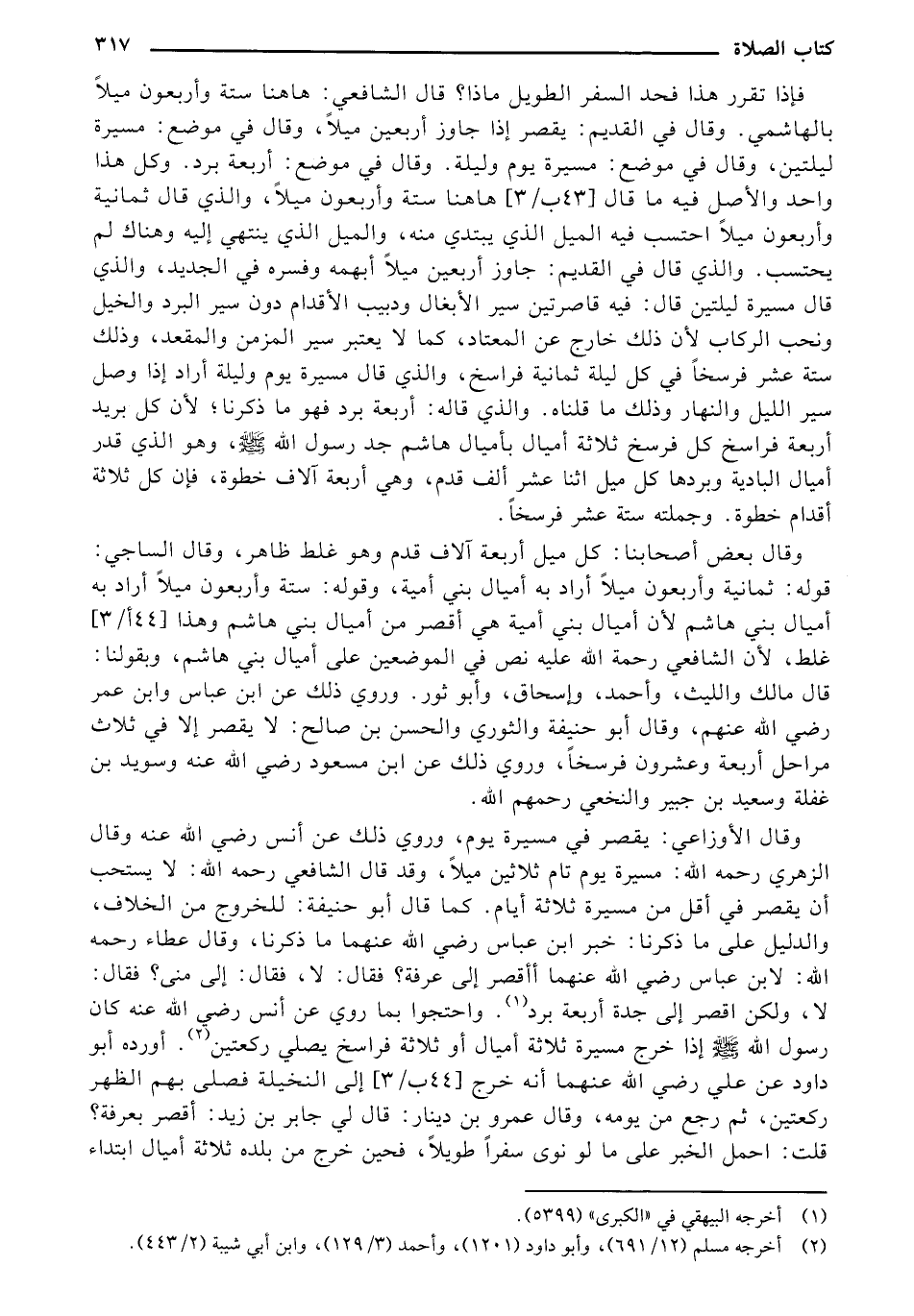 وقال بعض أصحابنا: كل ميل أربعة آلاف قدم وهو غلط ظاهر، وقال الساجي: قوله: ثمانية وأربعون ميلاً أراد به أميال بني أمية، وقوله: ستة وأربعون ميلاً أراد به أميال بني هاشم لأن أميال بني أمية هي أقصر من أميال بني هاشم وهذا [44 أ / 3] غلط، لأن الشافعي رحمة الله عليه نص في الموضعين على أميال بني هاشم، وبقولنا: قال مالك والليث، وأحمد، وإسحاق، وأبو ثور. وروي ذلك عن ابن عباس وابن عمر رضي الله عنهم، وقال أبو حنيفة والثوري والحسن بن صالح: لا يقصر إلا في ثلاث مراحل أربعة وعشرون فرسخاً، وروي ذلك عن ابن مسعود رضي الله عنه وسويد بن غفلة وسعيد بن جبير والنخعي رحمهم الله.