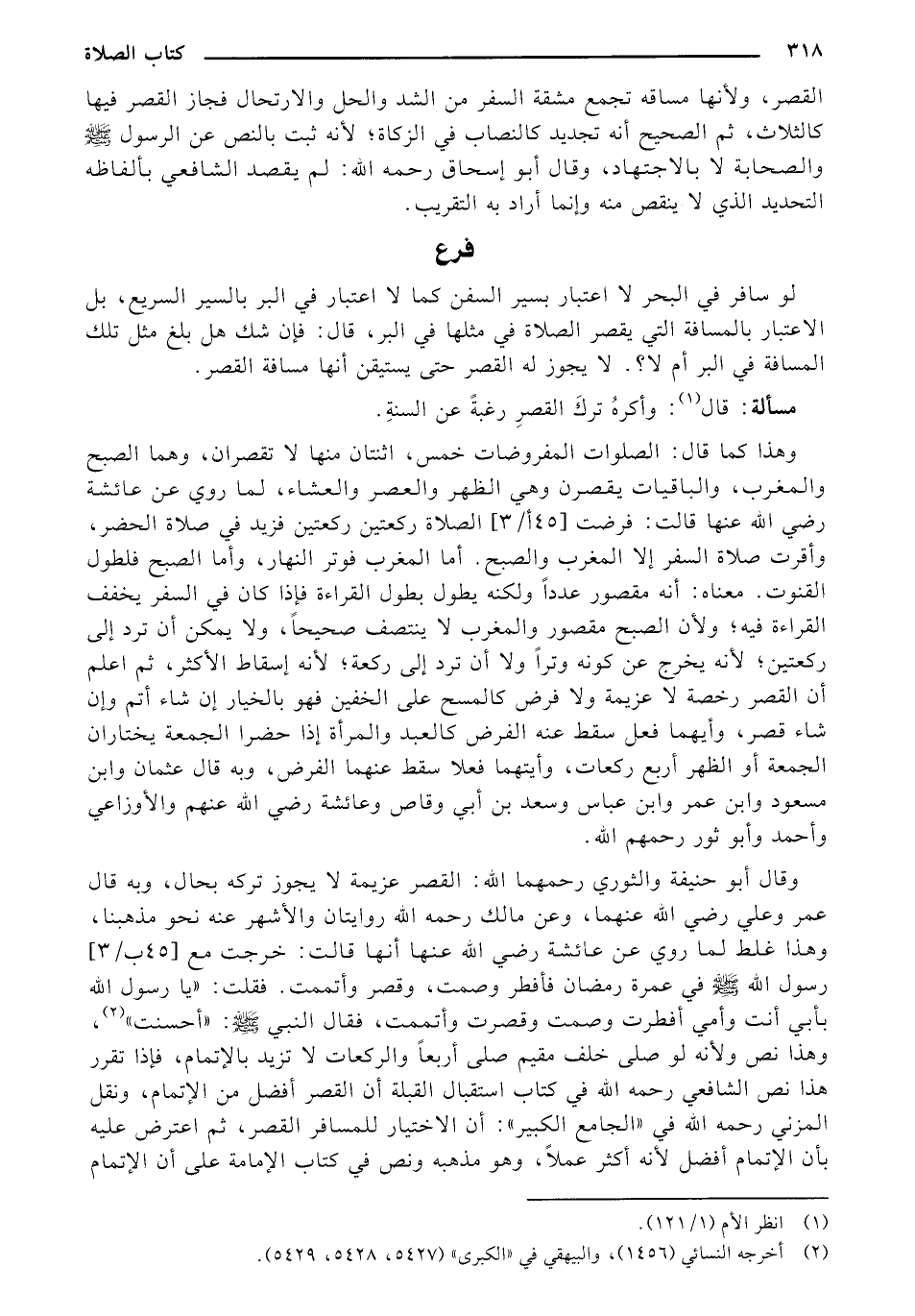 وهذا كما قال: الصلوات المفروضات خمس، اثنتان منها لا تقصران، وهما الصبح والمغرب، والباقيات يقصرن وهي الظهر والعصر والعشاء، لما روي عن عائشة رضي الله عنها قالت: فرفت [45 أ / 3] الصلاة ركعتين ركعتين فزيد في صلاة الحضر، وأقرت صلاة السفر إلا المغرب والصبح. أما المغرب فوتر النهار، وأما الصبح فلطول القنوت. معناه: أنه مقصور عدداً ولكنه يطول بطول القراءة فإذا كان في السفر يخفف القراءة فيه: ولأن الصبح مقصور والمغرب لا ينتصف صحيحاً، ولا يمكن أن ترد إلى ركعتين: لأنه يخرج عن كونه وتراً ولا أن ترد إلى ركعة: لأنه إسقاط الأكثر، ثم اعلم أن القصر رخصة لا عزيمة ولا فرض كالمسح على الخفين فهو بالخيار إن شاء أتم وإن شاء قصر، وأيهما فعل سقط عنه الغرض كالعبد والمرأة إذا حضرا الجمعة يختاران الجمعة أو الظهر أربح ركعات، وأيتهما فعلا سقط عنهما الفرض، وبه قال عثمان وابن مسعود وابن عمر وابن عباس وسعد بن أبي وقاص وعائشة رضي الله عنهم والأوزاعي وأحمد وأبو ثور رحمهم الله.