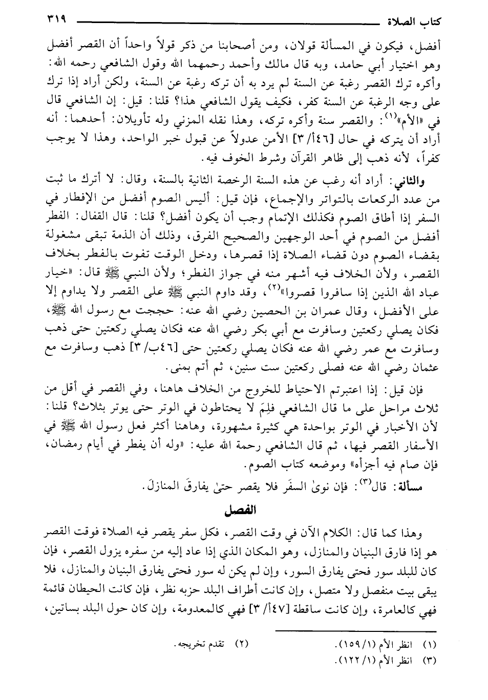 أفضل، فيكون في المسألة قولان، ومن أصحابنا من ذكر قولاً واحداً أن القصر أفضل وهو اختيار أبي حامد، وبه قال مالك وأحمد رحمهما الله وقول الشافعي رحمه الله: وأكره ترك القصر رغبة عن السنة لم يرد به أن تركه رغبة عن السنة، ولكن أراد إذا ترك على وجه الرغبة عن السنة كفر، فكيف يقول الشافعي هذا؟ قلنا: قيل: إن الشافعي قال في "الأم": والقصر سنة وأكره تركه، وهذا نقله المزني وله تأويلان: أحدهما: أنه أراد أن يتركه في حال [46 أ / 3] الأمن عدولاً عن قبول خبر الواحد. وهذا لا يوجب كفراً، لأنه ذهب إلى ظاهر القرآن وشرط الخوف فيه.