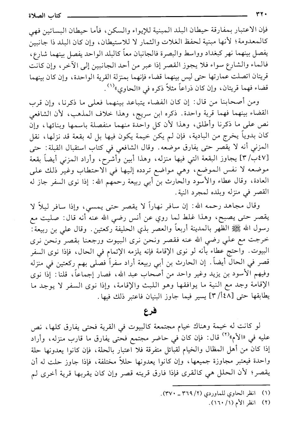 فإن الاعتبار بمفارقة حيطان البلد المبنية للإيواء والكن، فأما حيطان البساتين فهي كالمعدومة: لأنها مبنية لحفظ الغلات والثمار لا للاستيطان، وإن كان البلد ذا جانبين يفصل بينهما نهر كبغداد وواسط والبصرة فالجانبان معاً كالبلد الواحد يفصل بينهما شارع، فالماء والشارع سواء فلا يجوز القصر إذا عبر من أحد الجانبين إلى الآخر، وإن كانت قريتان اتصلت عمارتها حتى ليس بينهما قضاء فإنهما بمنزلة القرية الواحدة، وإن كان بينهما قضاء فهما قريتان، وان كان ذراعا مثلا ذكره في "الحاوي".