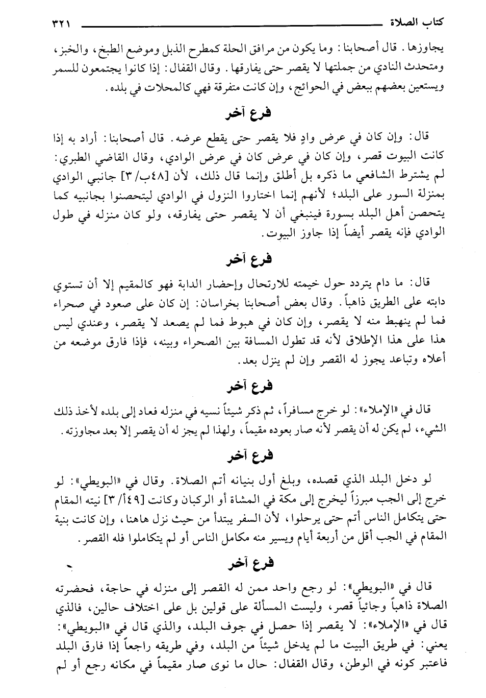 قال: ما دام يتردد حول خيمته للارتحال وإحضار الدابة فهو كالمقيم إلا أن تستوي دابته على الطريق ذاهباً. وقال بعض أصحابنا بخراسان: إن كان على صعود في صحراء فما لم ينهبط منه لا يقصر، وان كان في هبوط فما لم يصعد لا يقصر، وعندي ليس هذا على هذا الإطلاق لأنه قد تطول المسافة بين الصحراء وبينه، فإذا فارق موضعه من أعلاه وتباعد يجوز له القصر وان لم ينزل بعد.