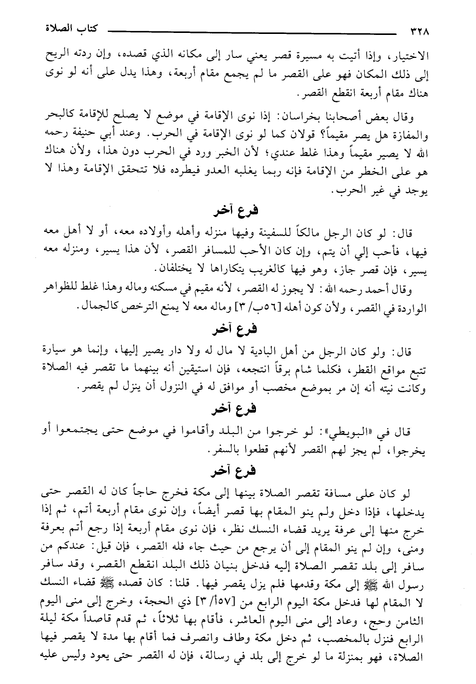 لو كان على مسافة تقصر الصلاة بينها إلى مكة فخرج حاجاً كان له القصر حتى يدخلها، فإذا دخل ولم ينو المقام بها قصر أيضاً، وإن نوى مقام أربعة أتم، ثم إذا خرج منها إلى عرفة يريد قضاء النسك نظر، فإن نوى مقام أربعة إذا رجع أتم بعرفة ومنى، وإن لم ينو المقام إلى أن يرجع من حيث جاء فله القصر، فإن قيل: عندكم من سافر إلى بلد تقصر الصلاة إليه فدخل بنيان ذلك البلد انقطع القصر، وقد سافر رسول الله - صلى الله عليه وسلم - إلى مكة وقدمها فلم يزل يقصر فيها. قلنا: كان قصده - صلى الله عليه وسلم - قضاء النسك لا المقام لها فدخل مكة اليوم الرابع من [57 أ / 3] ذي الحجة، وخرج إلى منى اليوم الثامن وحج، وعاد إلى منى اليوم العاشر، فأقام بها ثلاثاً، ثم قدم قاصداً مكة ليلة الرابع فنزل بالمخصب، ثم دخل مكة وطاف وانصرف فما أقام بها مدة لا يقصر فيها الصلاة، فهو بمنزلة ما لو خرج إلى بلد في رسالة، فإن له القصر حتى يعود وليس عليه