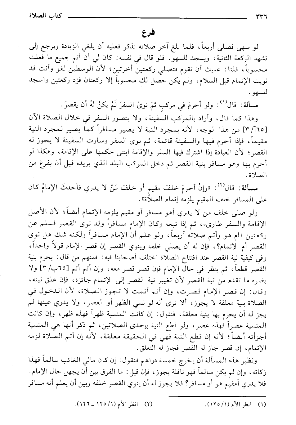 ولو صلى خلف من لا يدري أهو مسافر أو مقيم يلزمه الإتمام أيضاً؛ لأن الأصل الإقامة والسفر طارئ، ثم إذا تبعه وكان الإمام مسافراً وقد نوى القصر فسلم عن ركعتين قام هو وأتم صلاته أربعاً، ولو علم أن الإمام مسافراً ولكنه شك هل نوى القصر أم الإتمام؟، فإن له أن يصلي خلفه وينوي القصر إن قصر الإمام قولاً واحداً، وفي كيفية نية القصر عند افتتاح الصلاة اختلف أصحابنا فيه: فمنهم من قال: يحرم بنت القصر قطعا، ثم ينظر في حال الإمام فإن قصر قصر معه، وإن أتم أتم [65 ب / 3] ولا يضره ما تقدم من نية القصر لأن تغيير نية القصر إلى الإتمام جائزة، فإن علق نيته، وقال: إن قصر الإمام قصرت، وان أتم أتمت لا تجوز الصلاة، لأن الدخول في الصلاة بنية معلقة لا يجوز، ألا ترى أنه لو نسي الظهر أو العصر، ولا يدري عينها لم يجز له أن يحرم بها بنية معلقة، فنقول: إن كانت المنسية ظهراً فهذه ظهر، وان كانت المنسية عصراً فهذه عصر، ولو قطع النية بإحدى الصلاتين، ثم ذكر أنها هي المنسية أجزأته أيضا: لأنه إن قطع النية فهي في الحقيقة معلقة، لأنه إن أتم الصلاة لزمه الإتمام، إن قصر جاز له القصر فجاز له التعلق.