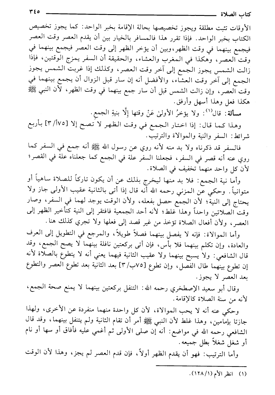 الأوقات تثبت مطلقة ويجوز تخصيصها بحالة الإقامة بخبر الواحد: كما يجوز تخصيص الكتاب بخبر الواحد. فإذا تقرر هذا فالمسافر بالخيار بين أن يقدم العصر وقت العصر فيجمع بينهما في وقت الظهر، وبين أن يؤخر الظهر إلى وقت العصر فيجمع بينهما في وقت العصر، وهكذا في المغرب والعشاء، والحقيقة أن السفر يمزج الوقتين، فإذا زالت الشمس يجوز الجمع إلى آخر وقت العصر، وكذلك إذا غربت الشمس يجوز الجمع إلى آخر وقت العشاء، والأفضل أنه إن سار قبل الزوال أن يجمع بينهما في وقت العصر، وان زالت الشمس قبل أن سار جمع بينهما في وقت الظهر، لأن النبي - صلى الله عليه وسلم - هكذا فعل وهذا أسهل وأرفق.