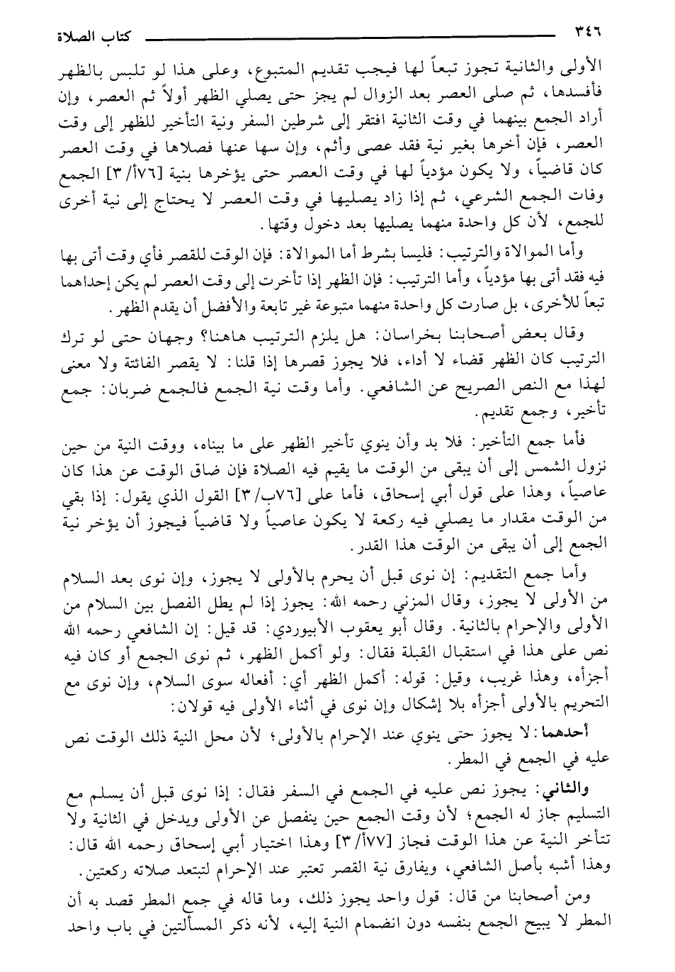الأولى والثانية تجوز تبعاً لها فيجب تقديم المتبوع، وعلى هذا لو تلبس بالظهر فأفسدها، ثم صلى العصر بعد الزوال لم يجز حتى يصلي الظهر أولاً ثم الحصر، وإن أواد الجمع بينهما في وقت الثانية افتقر إلى شرطين السفر ونية التأخير للظهر إلى وقت العصر، فإن أخرها بغير نية فقد عصى وأثم، وإن سها عنها فصلاها في وقت الحصر كان قافياً، ولا يكون مؤدياً لها في وقت العصر حتى يؤخرها بنية [76 أ / 3] الجمع وفات الجمع الشرعي، ثم إذا زاد يصليها في وقت العصر لا يحتاج إلى نية أخرى للجمع، لأن كل واحدة منهما يصليها بعد دخول وقتها.